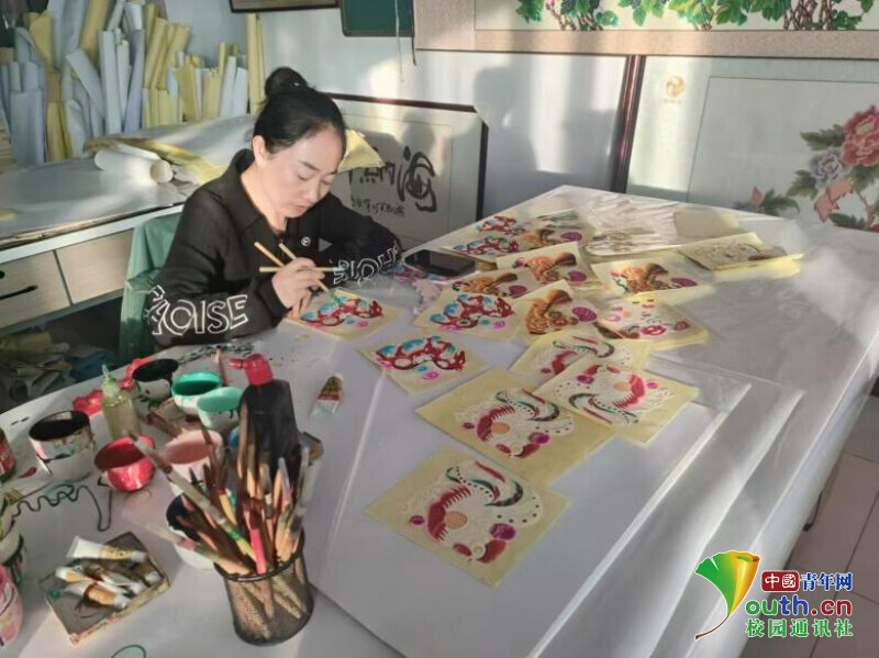 团队来到蔚县名家剪纸艺术品商贸有限公司。在这里,团队成员先后参观了刀刻车间、晕染车间、装裱车间,从熏样到刻制,从着色到装裱,亲眼见证了一份份剪纸作品的诞生过程。岁末年初,正是剪纸产品销售的高峰期,走进车间,看到的是一位位工人师傅忙碌的身影。