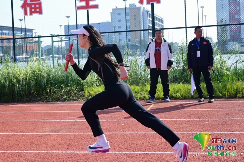 图为女子接力运动员领跑赛场。张浩翔 供图