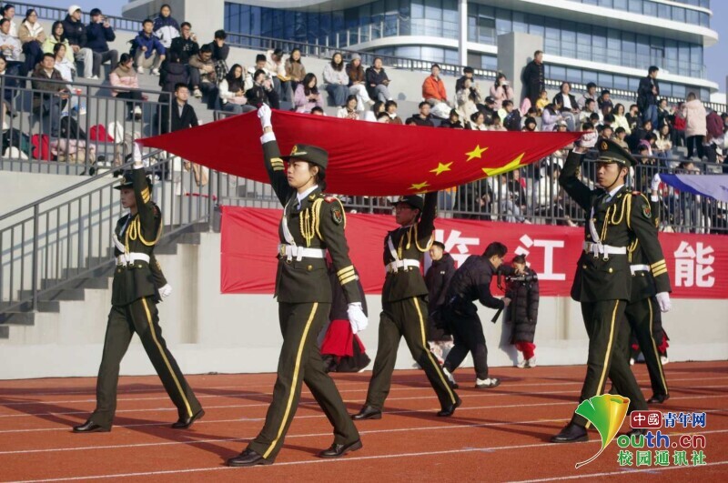 图为运动会开幕式上女子升旗队在国歌声中迈步向前。许诺 供图