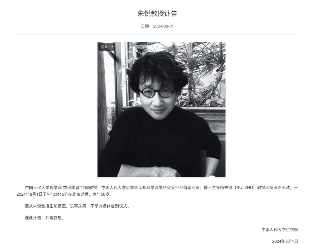 中国人民大学哲学院“杰出学者”特聘教授、中国人民大学哲学与认知科学跨学科交叉平台首席专家、博士生导师朱锐(RUI ZHU)教授因病医治无效,于2024年8月1日下午13时15分在北京逝世,享年56岁。遵从朱锐教授生前遗愿,丧事从简,不举办遗体告别仪式。谨此讣告,共寄哀思。中国人民大学哲学院2024年8月1日
