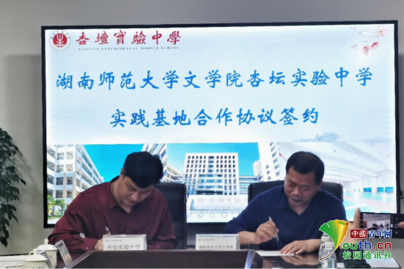 图为文学院副院长岳凯华、杏坛实验中学校长曾国徽签署合作协议。中国青年网通讯员 王小玉 供图