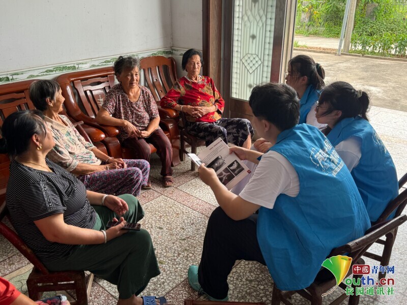 图为宣讲团成员与老奶奶围坐,聆听老奶奶的岁月故事。庄芷游 供图