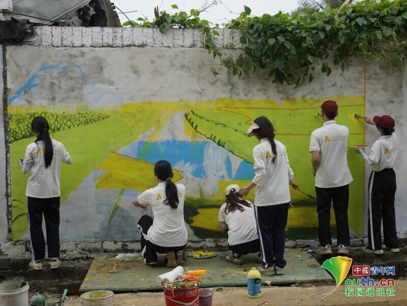 图为突击队员在为大雨冲刷过的墙绘补色。中国青年网通讯员 谢华锋 供图