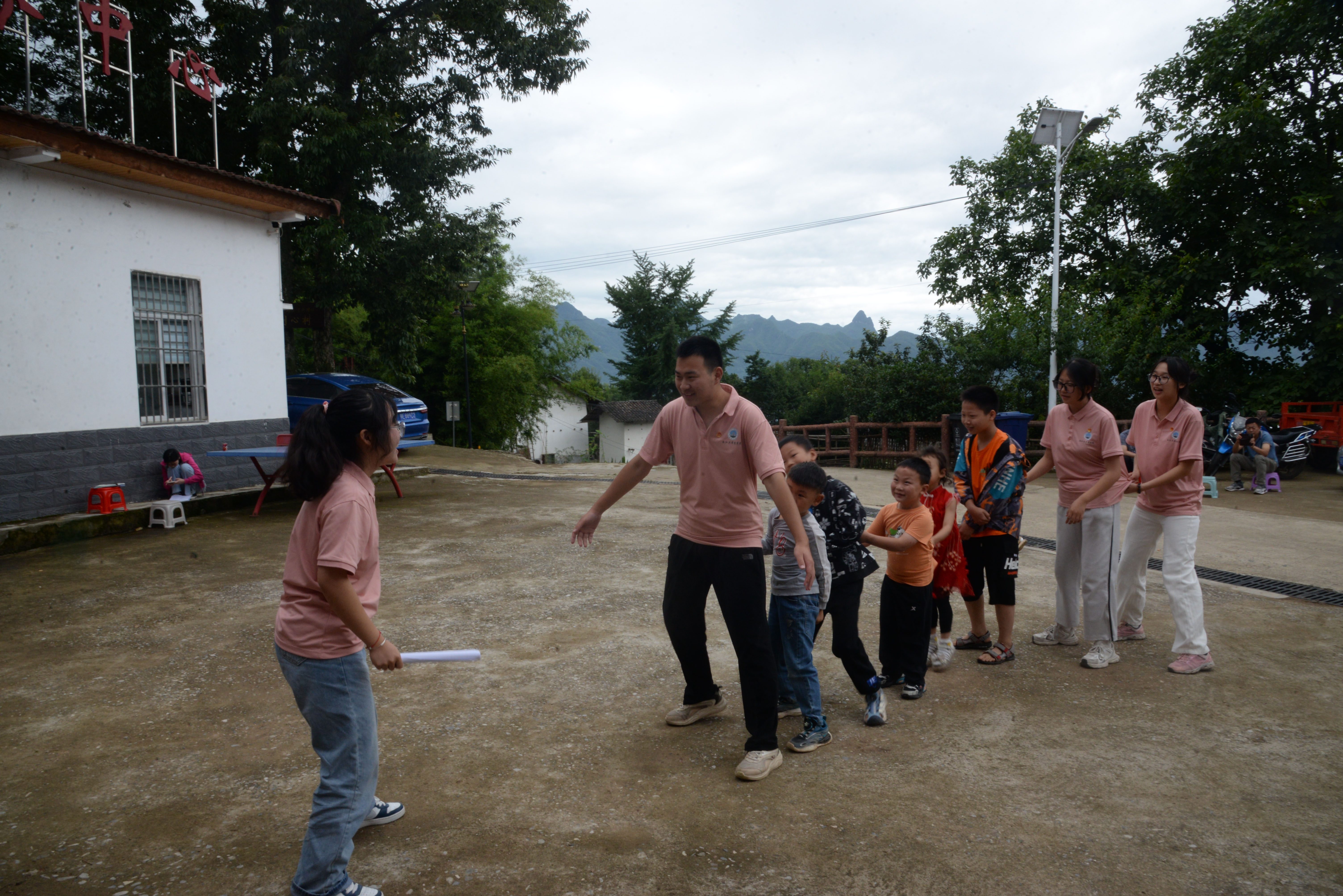 图为队员们正与小朋友们一起玩“老鹰捉小鸡”的游戏。中国青年网通讯员 李慧明 摄