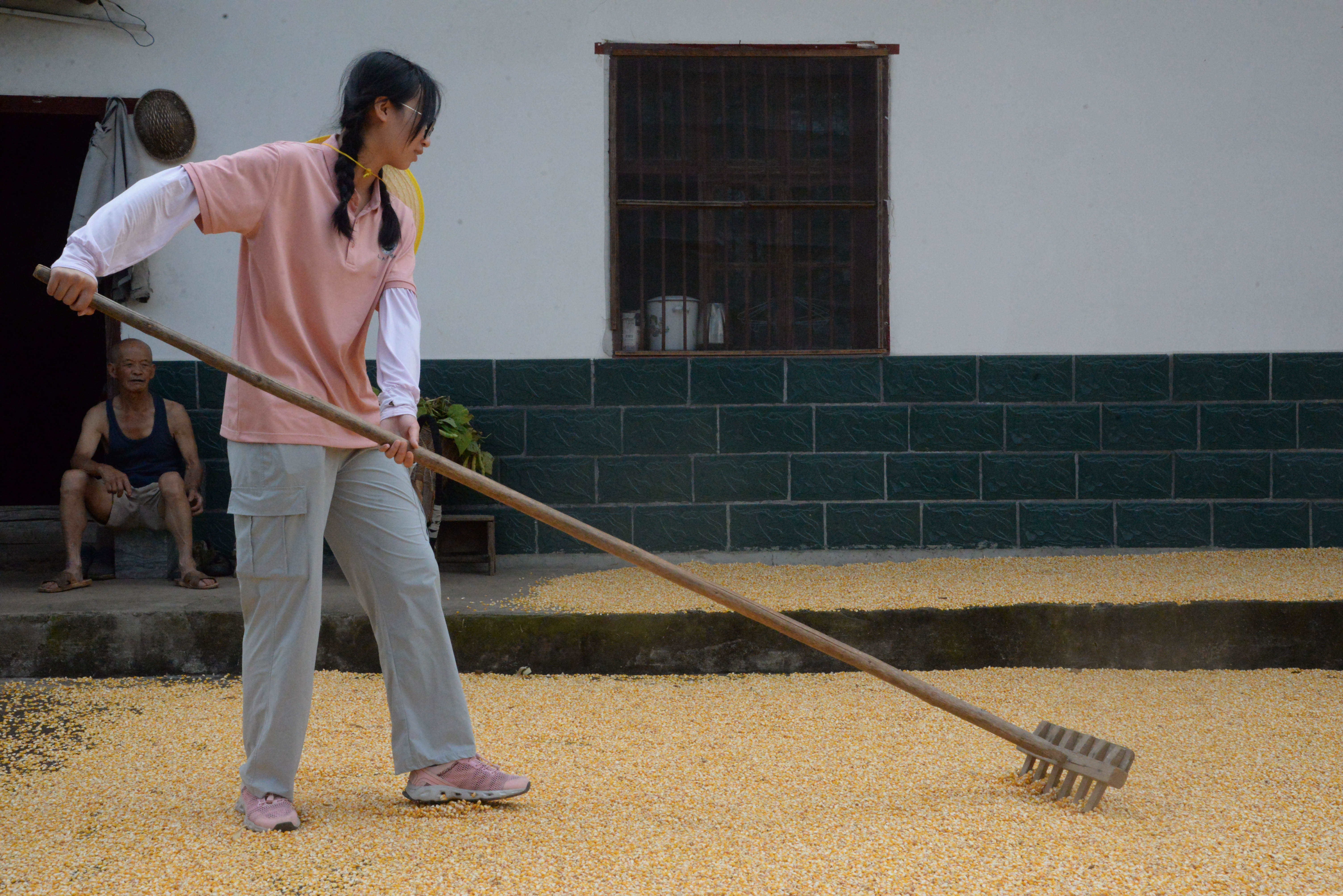 图为队员正在帮农户翻晒玉米,晒一晒保存更长久。中国青年网通讯员 李雅倩 摄