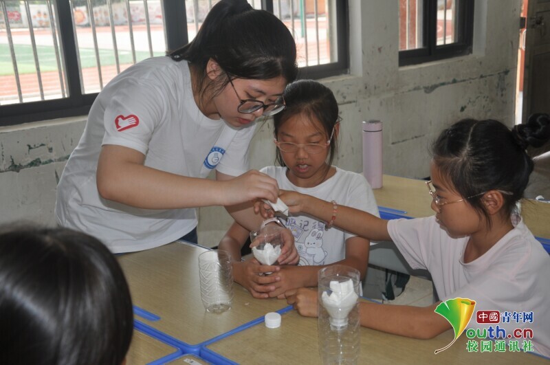 图为实践队员俯身指导小朋友动手操作污水过滤实验。马芯仪 供图