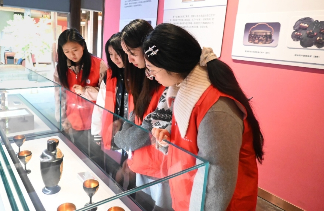 图为中心成员们参观木胎花鸟印锦酒具。黄一真 供图
