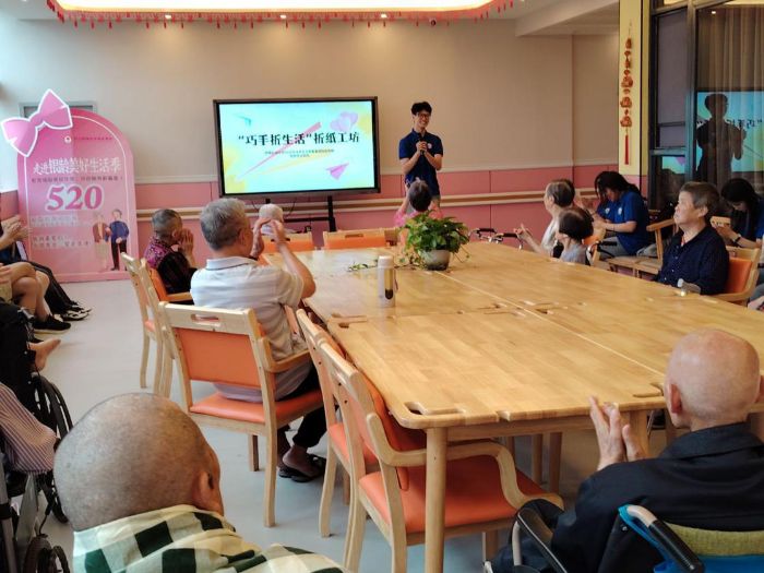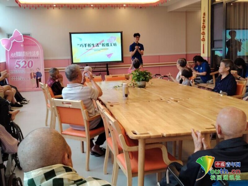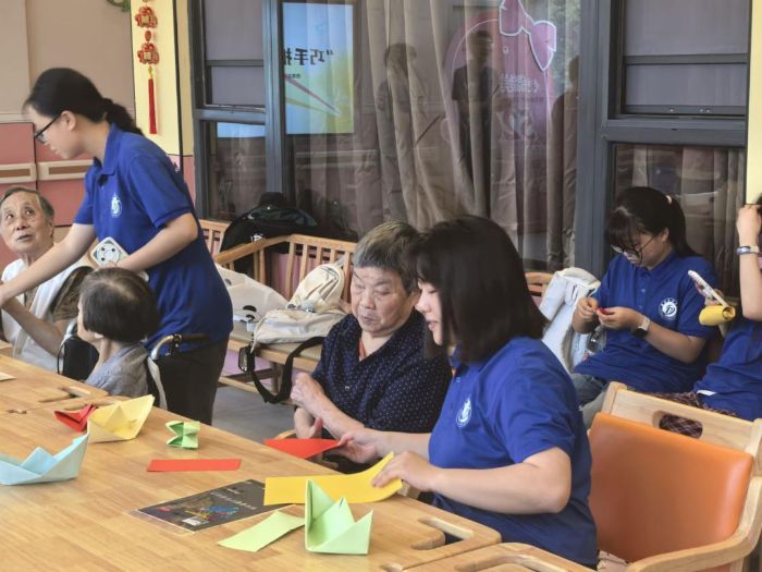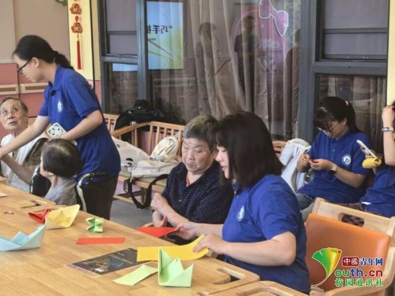 图为实践队员在“巧手折生活”创意折纸工坊中一对一指导老人制作纸鹤。 蓝晟铭 供图