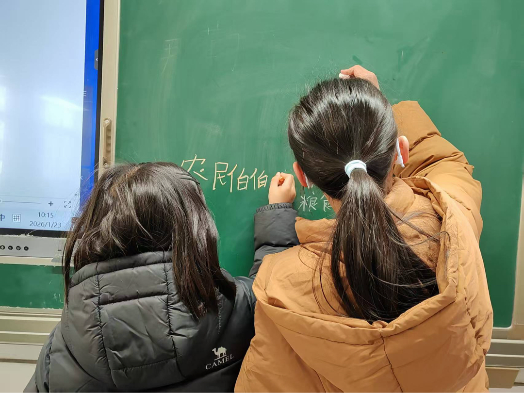 图为志愿者在黑板上精心设计的游戏规则板书与“绿色愿望墙”。凌奕书 供图