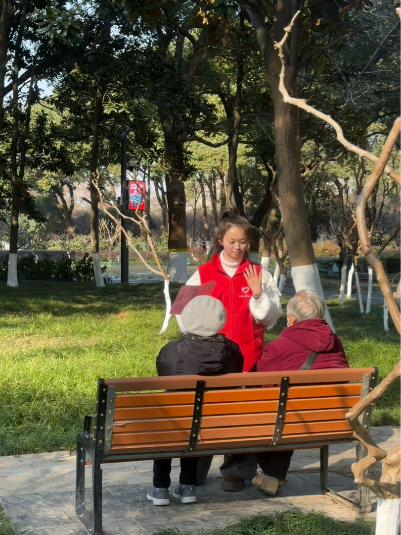 图为实践队员在雨山湖公园向市民发放“森林防火”与“低碳生活”宣传单,耐心地向过往老人讲解冬季森林防火知识与环保政策。夏瑞琪 供图