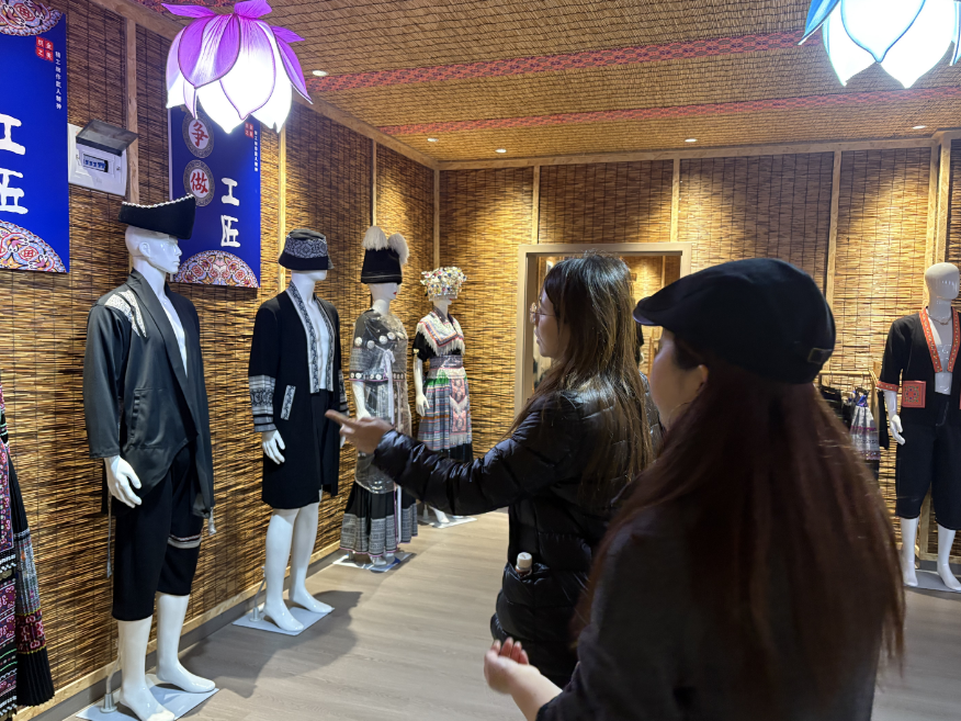在织金元素蜡染刺绣有限责任公司,团队了解到,该企业将传统苗族蜡染与现代设计结合,开发出服装、配饰、家居等现代产品,同时为当地妇女提供了就业岗位。企业负责人介绍,其在传承蜡染技艺的基础上,设计出了鞋帽、首饰等配套产品,突破了传统创作多聚焦版型设计与绣片制作的局限。“传统形制的服饰往往难以融入现代日常穿搭场景,大家不会穿出门,所以我要尝试改版成现代的服饰。”该负责人表示。