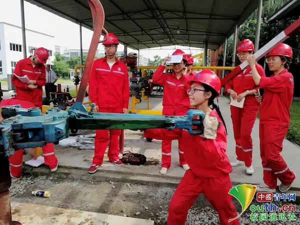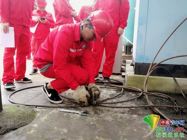 看完指导老师的展示操作后,一位女同学自告奋勇,站出来第一个动手操作练习,图为该同学正在操作使用钻井工程的专业工具液压大钳。 中国青年网通讯员 张子文 摄