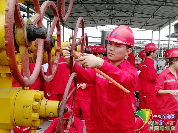 “看别人操作很简单,自己动手才知难”,一系列看似简单的实践操作,却难倒了不少同学,也让同学们更加体会到实践的重要性,图为实践队员在开启采油树上的阀门。 中国青年网通讯员 张子文 摄