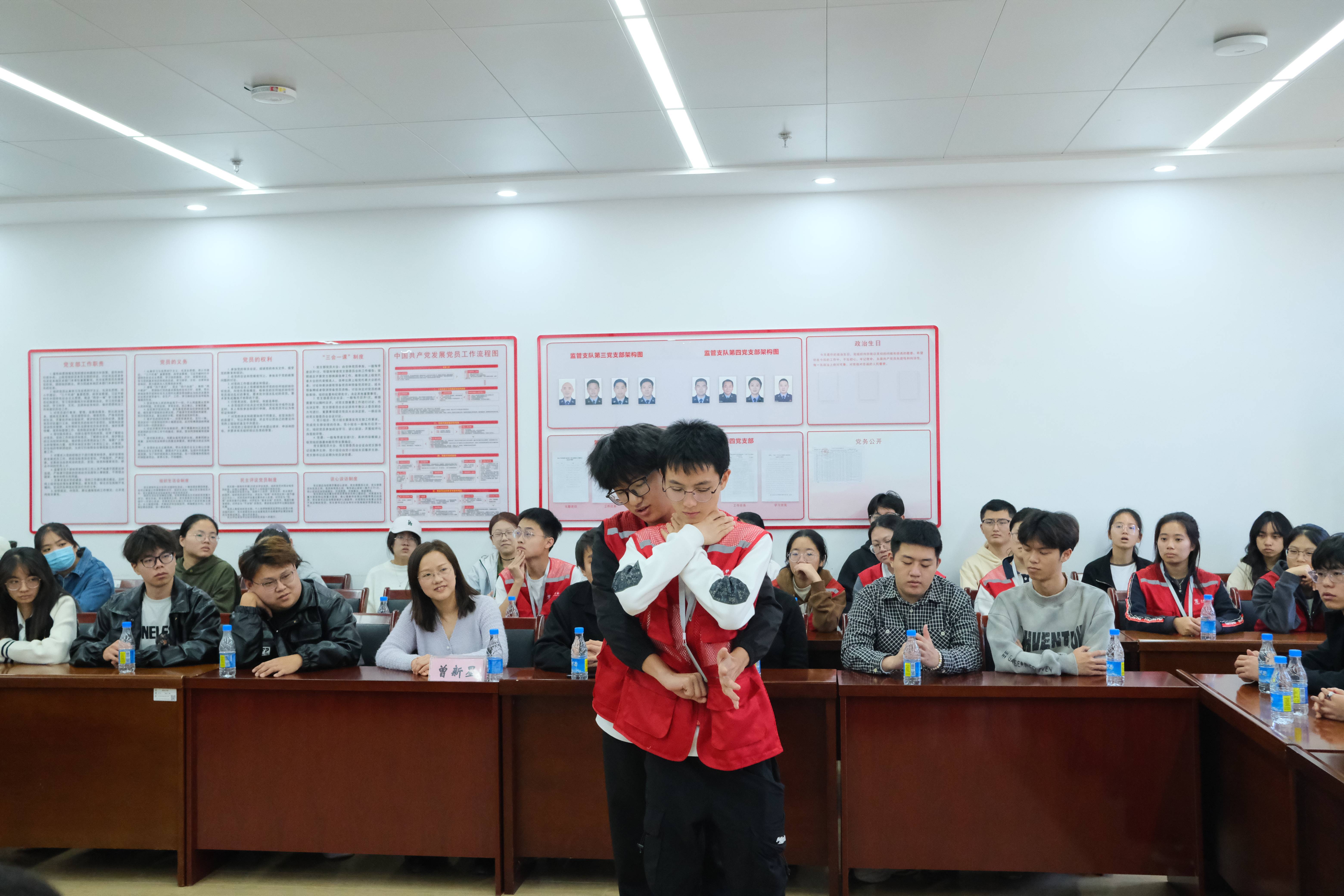 随后活动来到宣讲科普环节,南昌大学3S救护会也来到了戒毒所开展急救知识宣讲活动。宣讲内容涵盖体外心肺复苏术(CPR)和海姆利克急救法等实用急救技术。宣讲过程中,南昌大学学生对急救技术的原理和操作流程进行了详细讲解与示范。活动现场,戒毒所民警及南昌大学师生积极参与。戒毒所民警通过此次活动学习了应对突发状况的急救技能,而医学生也在讲解中进一步巩固了专业知识。