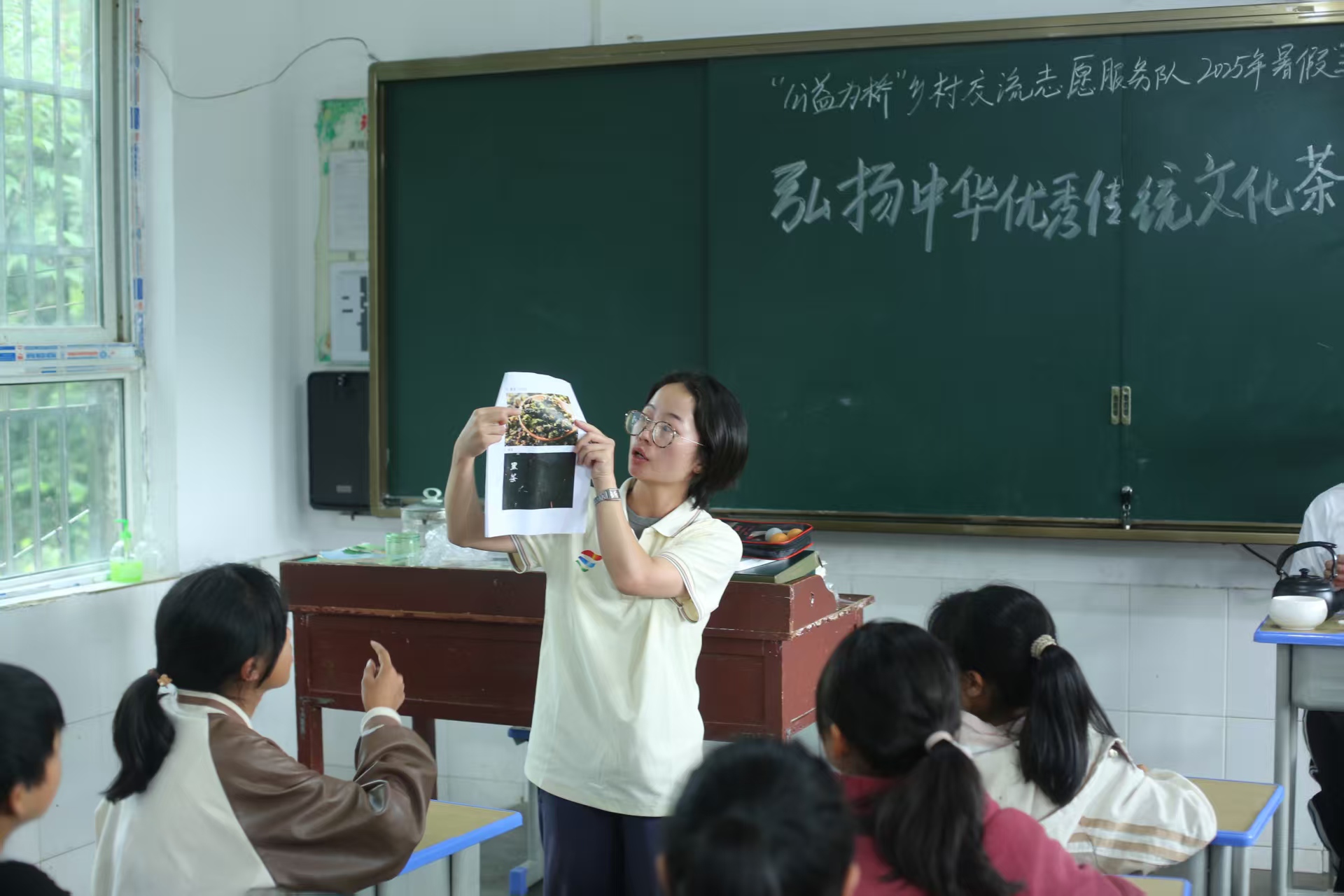 “公益为桥”志愿服务队用图片向前进小学六年级学生介绍六大茶类。沈长东 供图