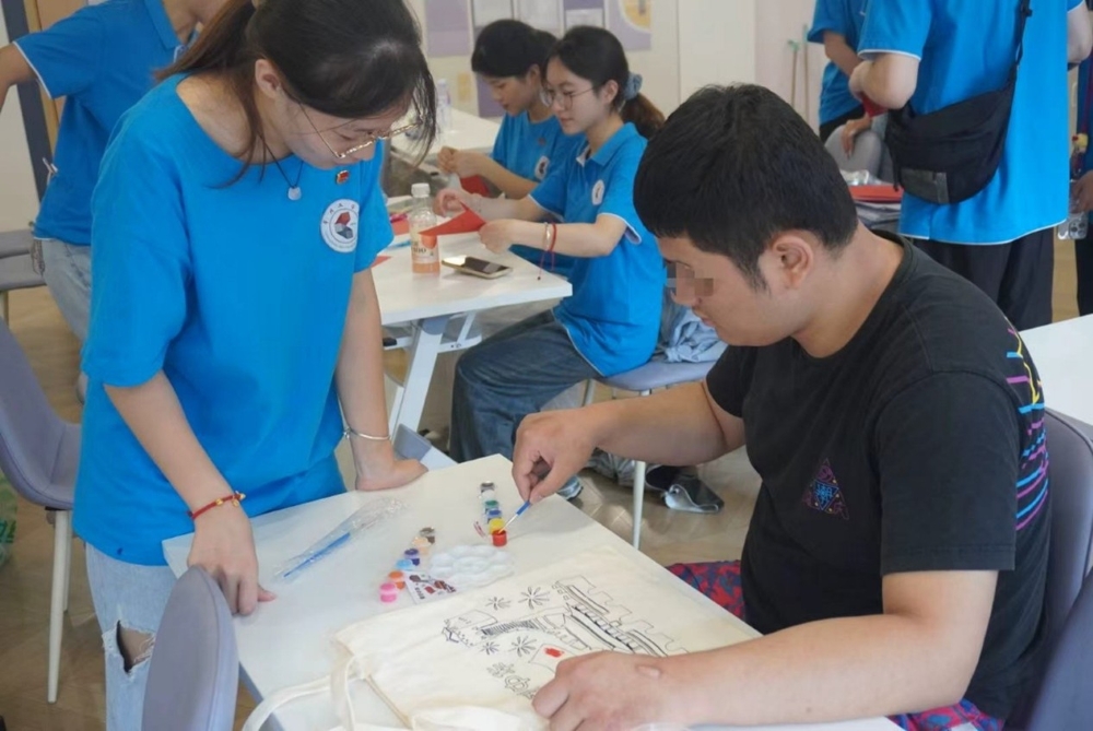 图为实践队员徐蒙慧指导残疾人朋友在帆布包上进行红色主题DIY创作。倪佳灵 供图