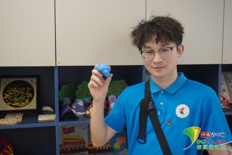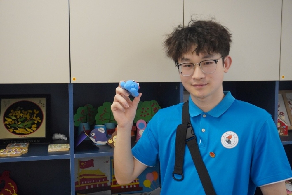 图为实践队员王宇晨与残疾人朋友的手工作品合照。倪佳灵 供图