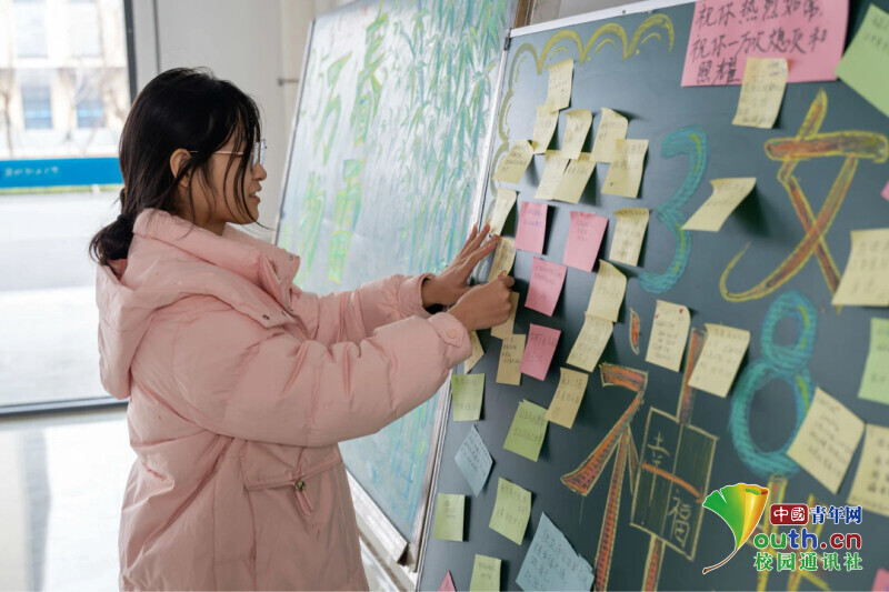 图为信息工程学院的同学将自己写的内容粘贴到黑板上。郭菁 供图