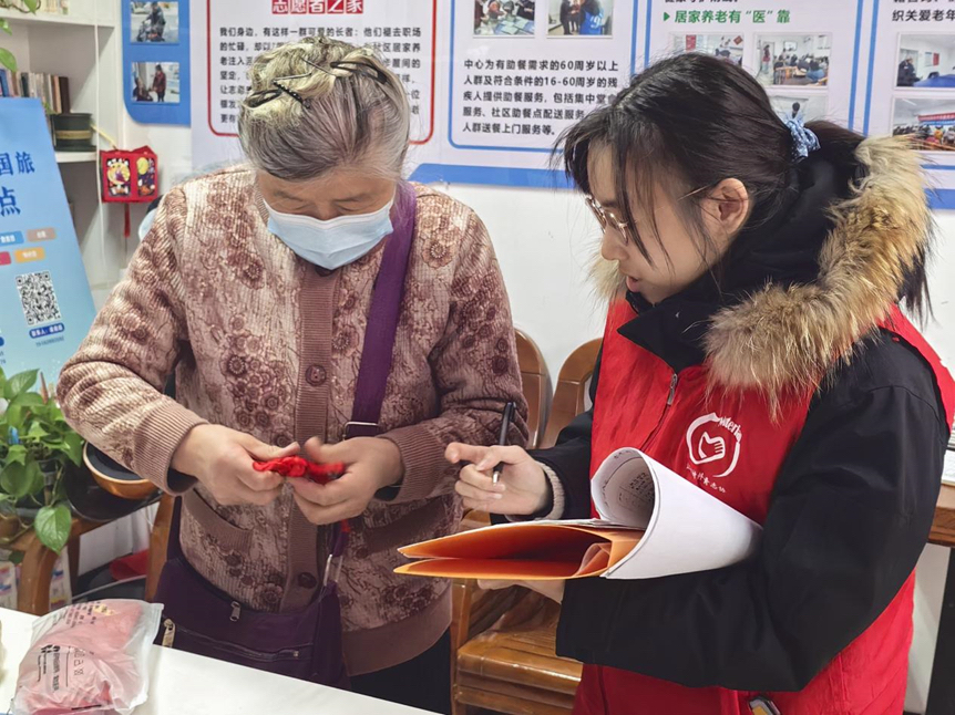 编织过程中,志愿者同步开展“聆听老故事”访谈活动。六旬的陈奶奶一边编结,一边回忆起童年春节的点滴:“小时候,过年是天大的事!从小年就开始忙活,扫房除尘、贴窗花、炸丸子,那股香味儿能飘满整条巷子。”她笑着说起“守岁”,“除夕夜围炉听长辈讲‘年’的传说,数着鞭炮声等新年,一家人团团圆圆,比什么都热闹。”