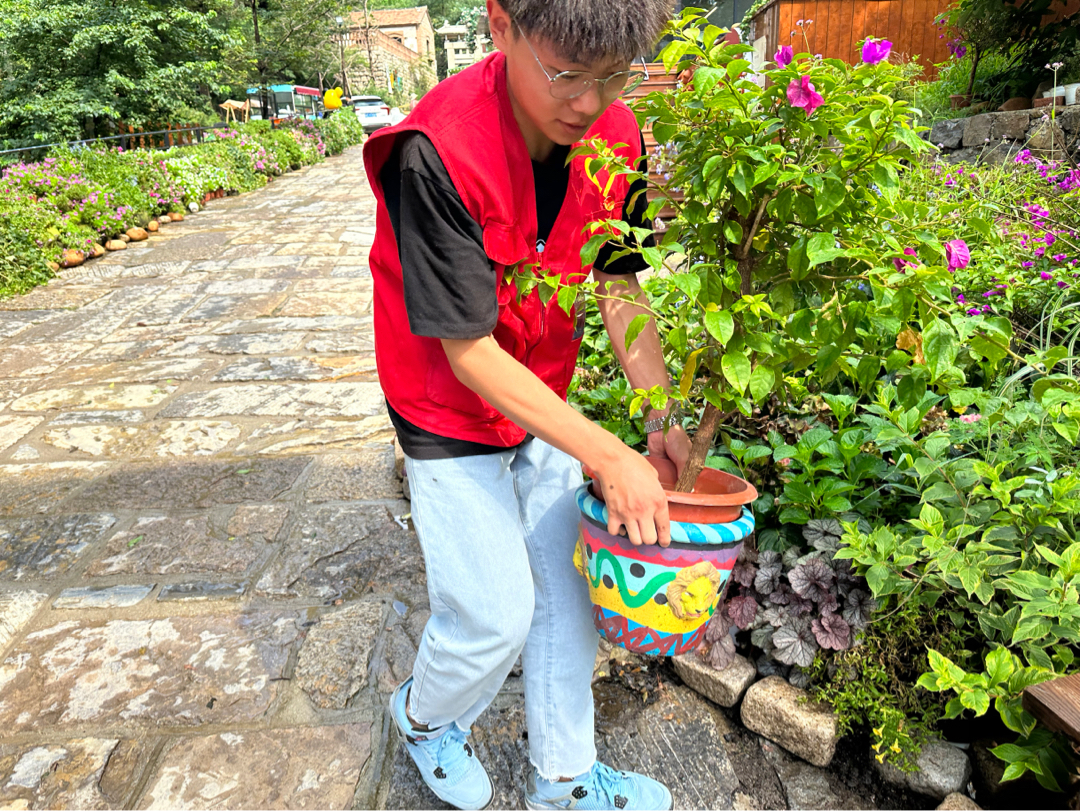 图片为宣讲队志愿者帮助景区工作者搬运花盆。中国青年网通讯员 臧运雨 供图