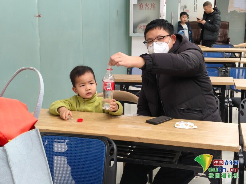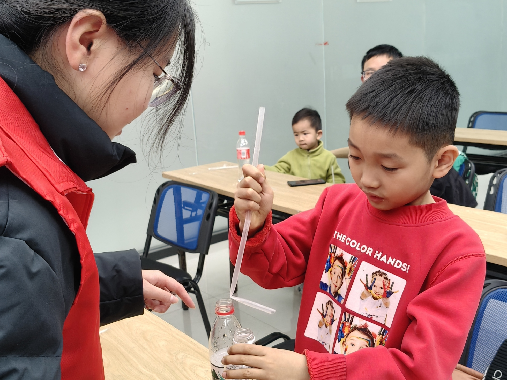 图为在志愿者的一对一协助下,小朋友亲自动手完成“吸管提起水瓶”的趣味科学实验。时佳艺 供图