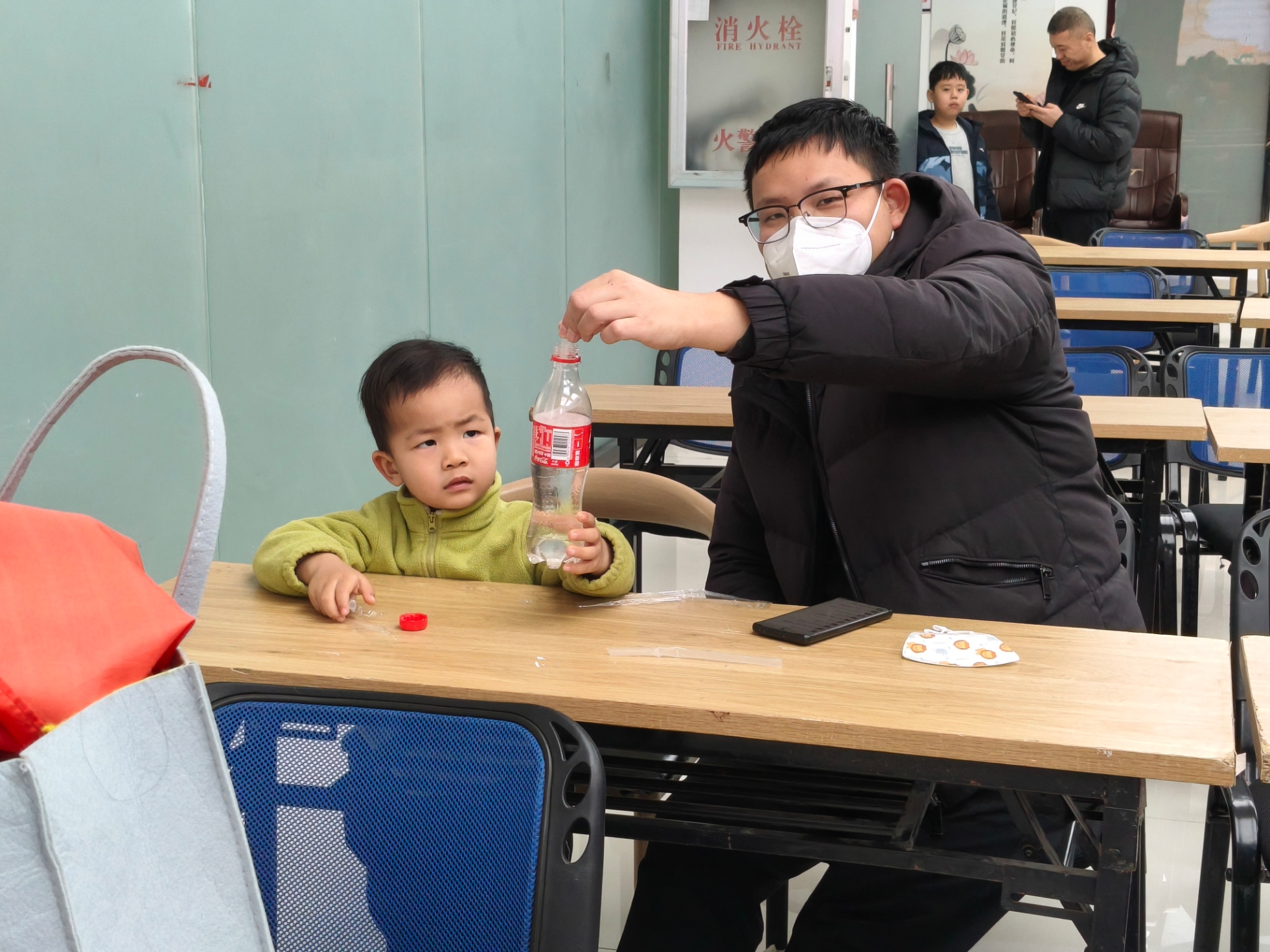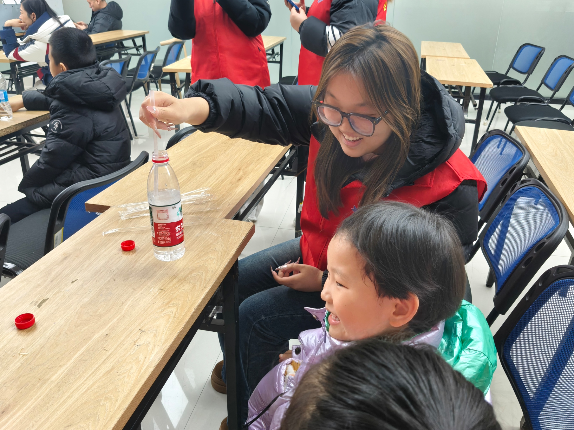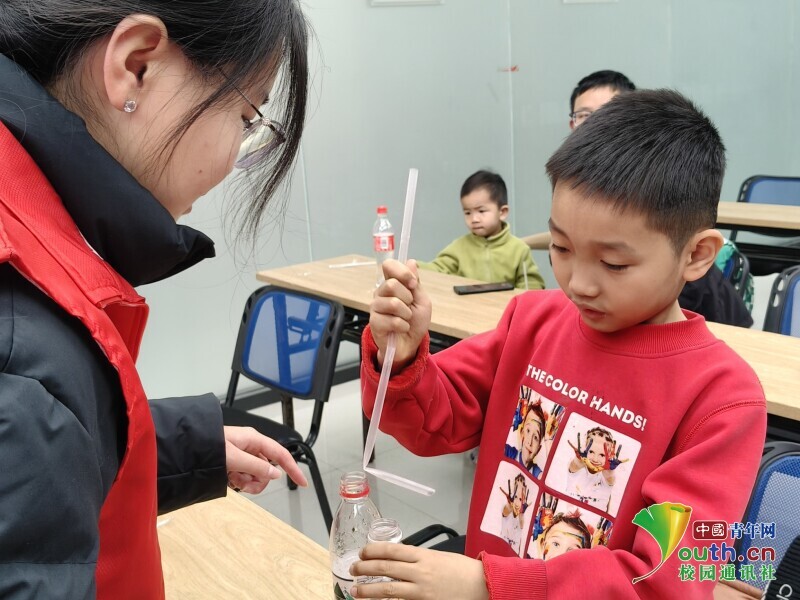 图为志愿者俯身指导,小朋友手持吸管,认真地将其弯折后插入水瓶,亲手尝试“吸管提瓶”的趣味实验。时佳艺 供图