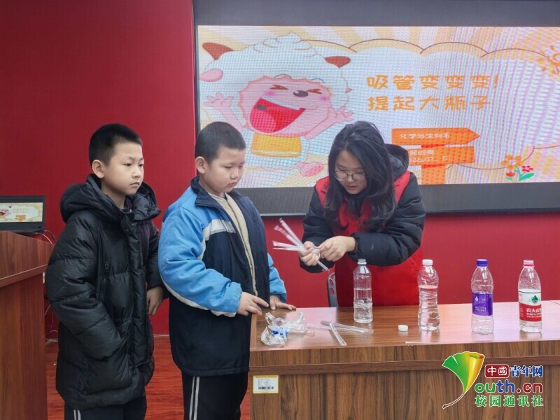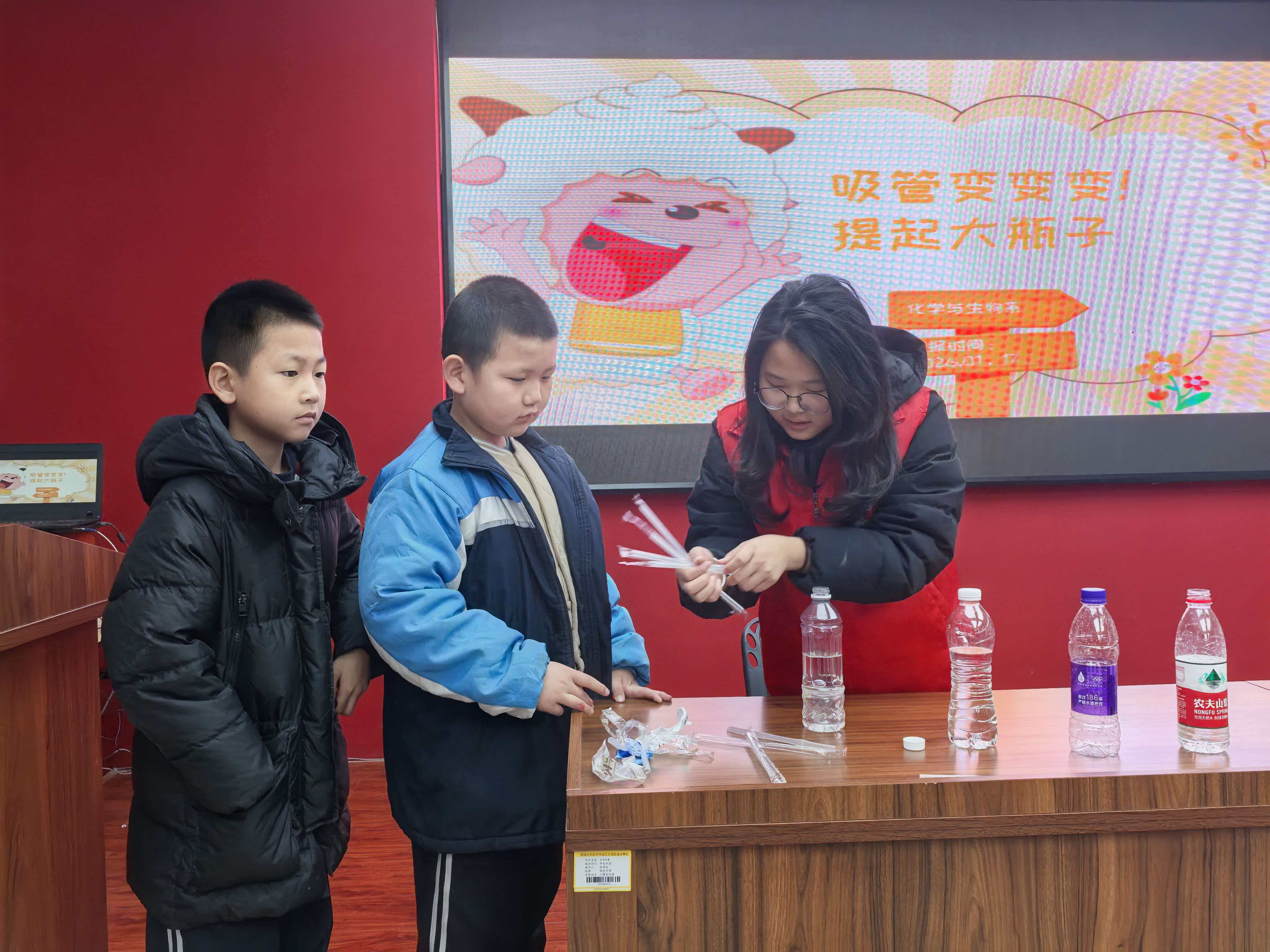 图为志愿者站在展示“吸管提起大瓶子”实验步骤的大屏幕前,为孩子们演示“吸管提起大瓶子”的趣味物理实验。时佳艺 供图