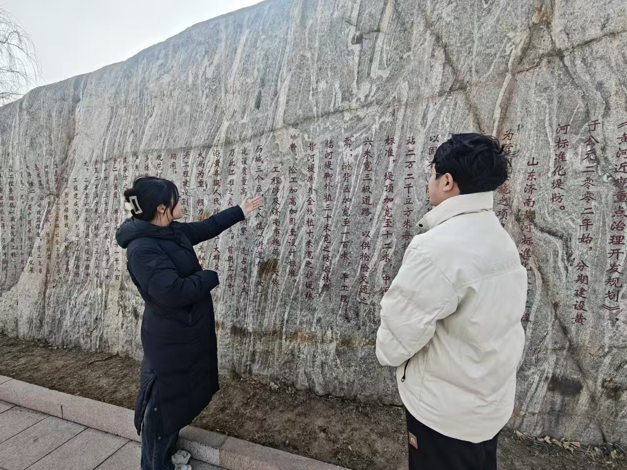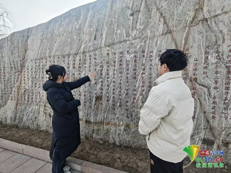 随后,同学们来到“济南黄河简介”石碑前,在讲解员的补充介绍下,全面梳理了济南黄河的历史变迁、水文特征与多年来的治理成就。从昔日的“水患频发”到如今的“安澜无恙”,从单纯的防洪治理到生态保护与高质量发展协同推进,济南黄河段的蝶变,让同学们深刻认识到黄河不仅是维系北方生态安全的重要生态屏障,更是承载着中华传统文化、滋养沿岸万千民生的“幸福河”。这份认知也让大家的生态保护使命感愈发强烈,更清晰地意识到青年一代在黄河生态保护事业中肩负的责任。