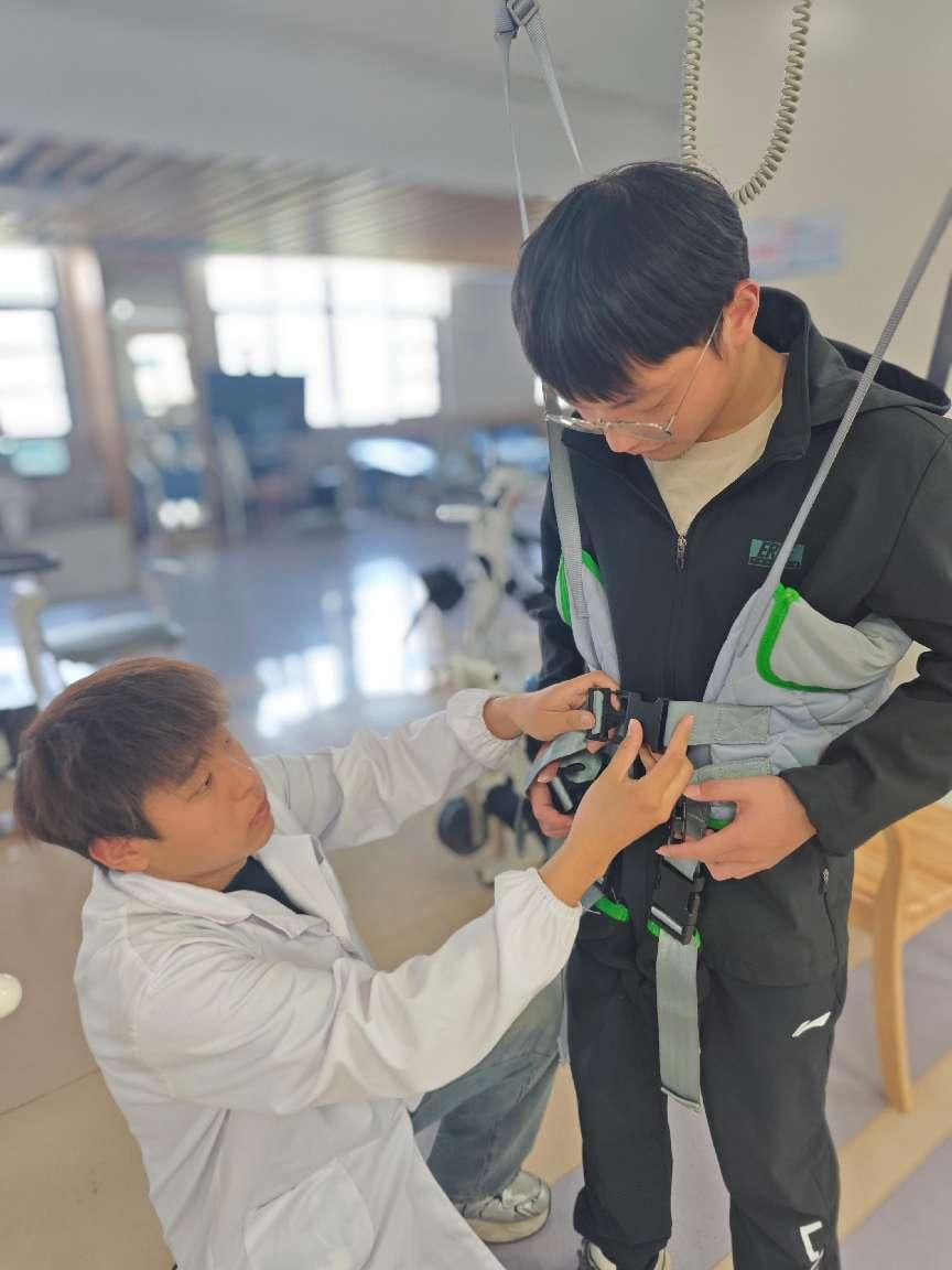 图为团队成员为患者固定康复器械。潘筱睿 供图