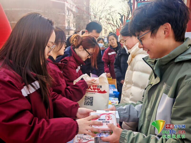 图为志愿者向参与学生发放防艾宣传物资,同学们有序领取并了解物资中的防艾内容。温晓仪 供图