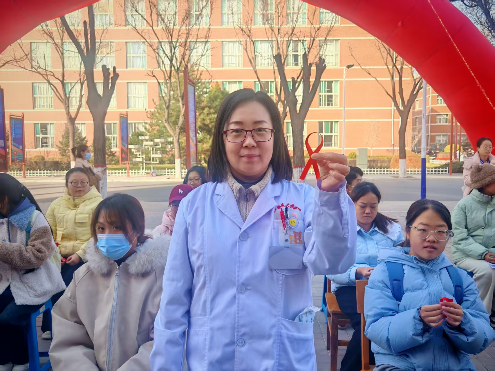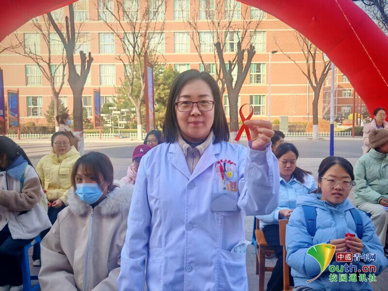 图为医护人员和志愿者手持红丝带现场演示,指导同学们亲手制作抗艾标识。温晓仪 供图