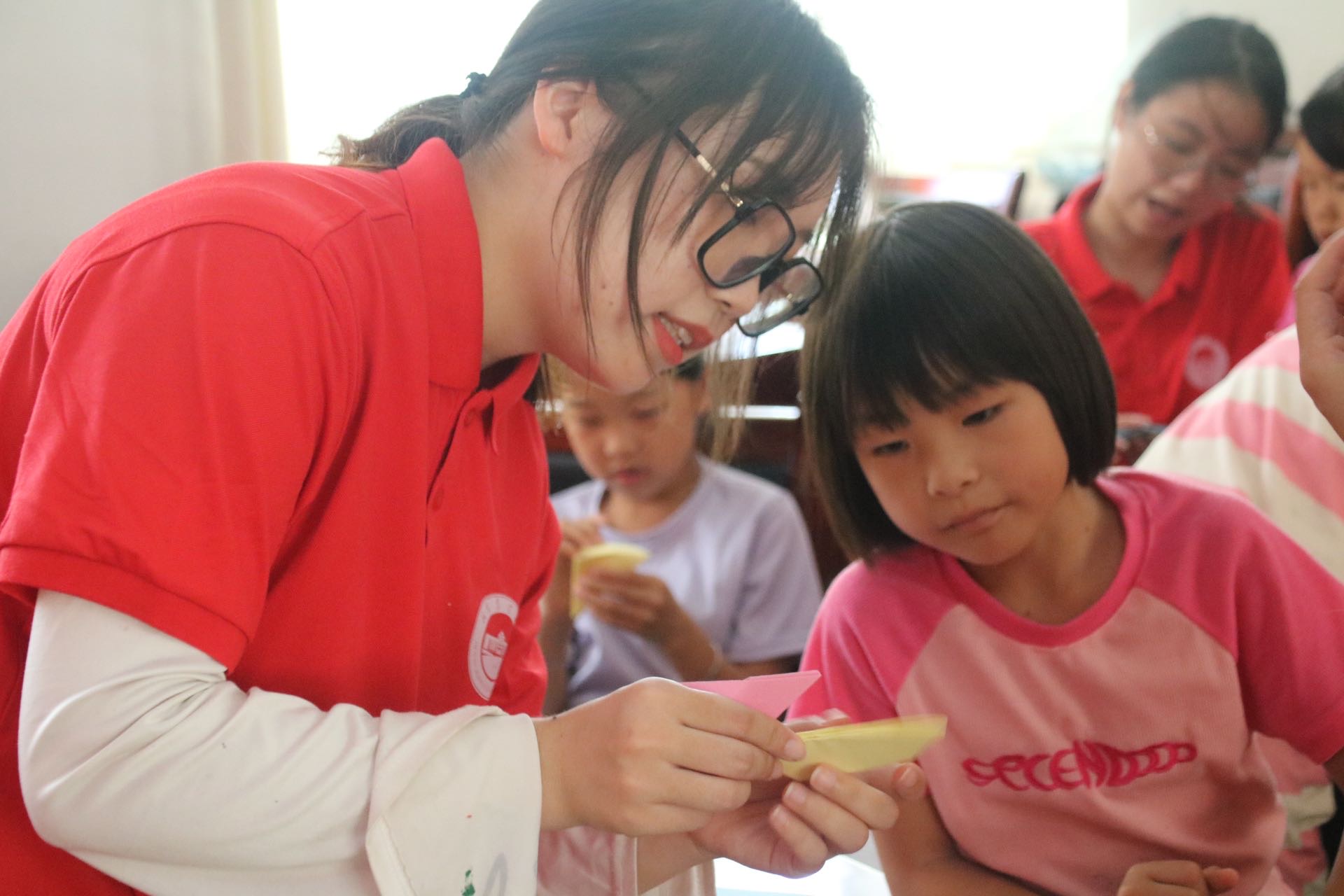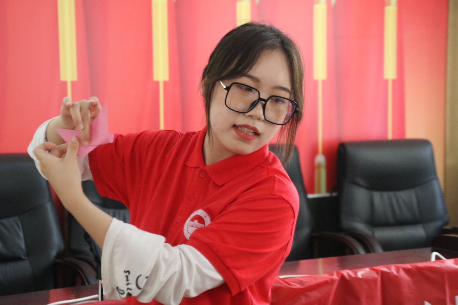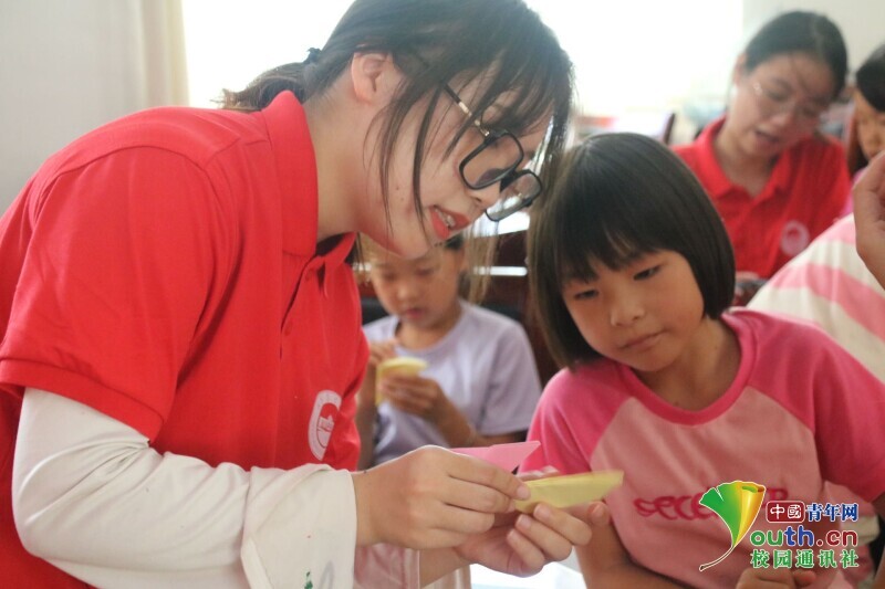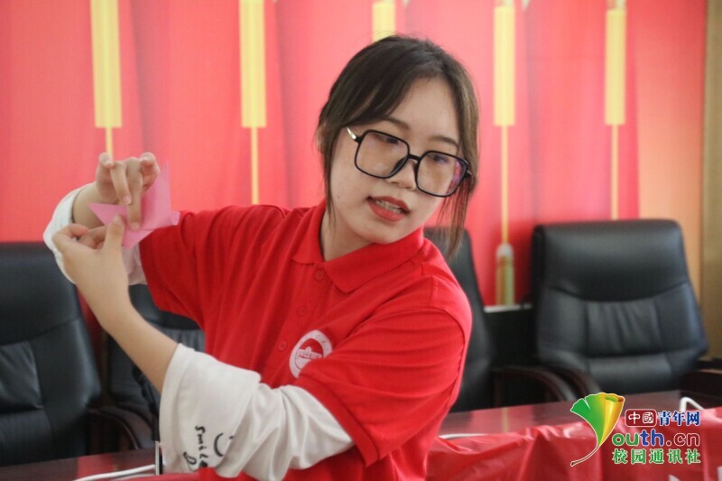 图为折纸课上团队成员王蕾正在耐心的进行折纸教学。中国青年网通讯员 罗紫维 供图