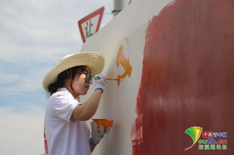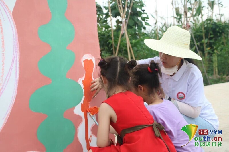 图为团队成员文玟带领孩子们进行简单的墙绘。中国青年网通讯员 罗紫维 供图