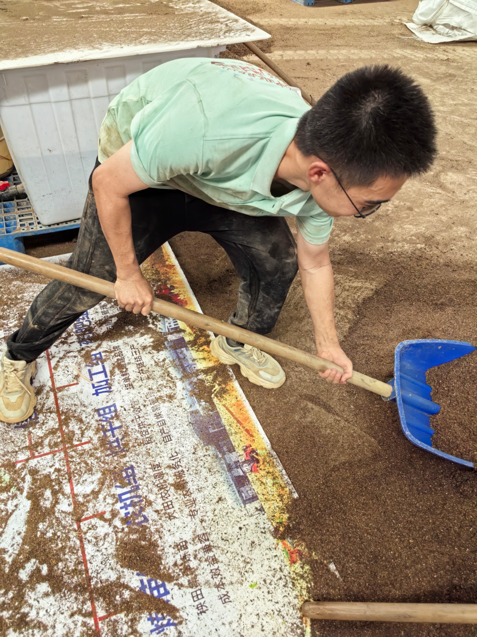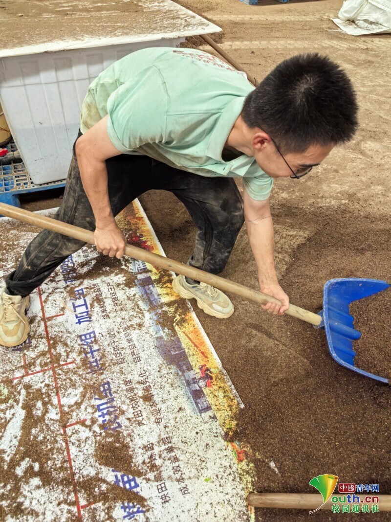 一开始,实践团在体积巨大的农用容器和高速运转的育秧机械面前不知所措,幸好亲切友善的员工们一步一步示范指点、传授经验,实践团成员最终掌握了药剂浸种时烯效唑、14-羟基芸苔素甾醇等药品的用量,在生产实践中加深了对《种子学》课本上的种子活力等知识的认知(比如一年陈谷子需浸种18小时,清洗沥干24小时后才能出芽,而当年新收割的谷子浸种18小时后,清洗沥干只需12个小时即可出芽),并通过生产线了解到现代机械化育秧的具体步骤——摆育秧盘、覆底土并浇水、匀速倾倒点种、覆表土并浇水、堆叠后移入暗化室、暗化两天后拿到大田上炼苗、大田炼苗15-20天后可通过机械插秧……