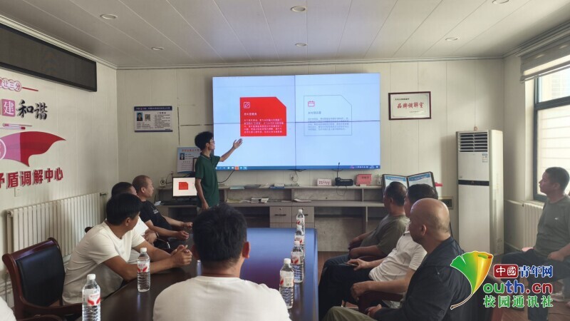 图为团队成员为村民播放反诈视频。 刘文斌 供图