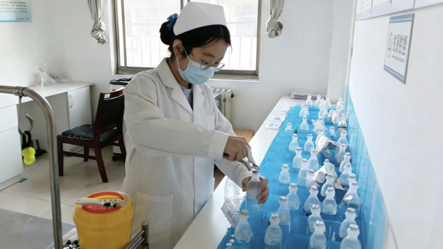 图为实践队员于临清市唐园中心卫生院进行医疗学习。韩佳乐 供图