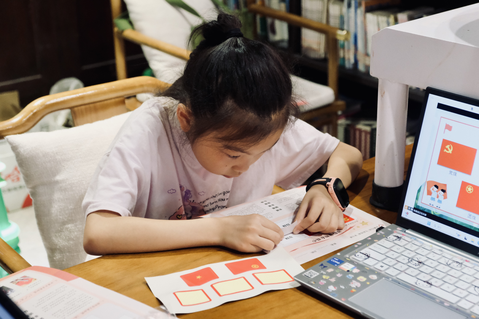 图为小朋友专心完成题卡上面的贴纸小任务。周思甜 供图