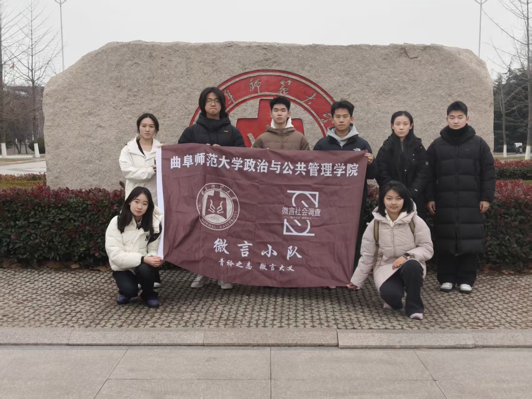 图为微言小队队员与校徽石的合影。江百舸 供图