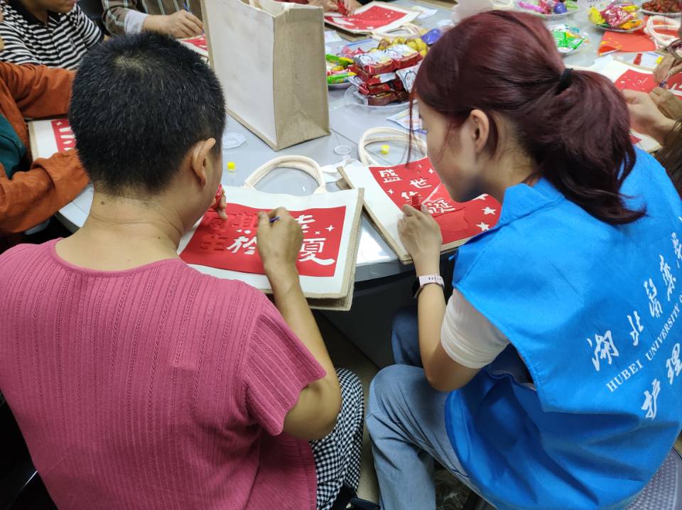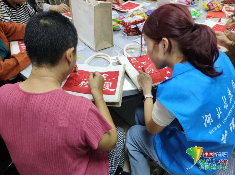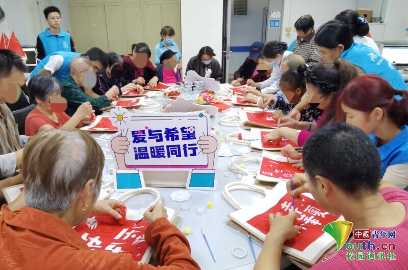 图为志愿者帮助奶奶完成包包制作。李晓鹏 供图