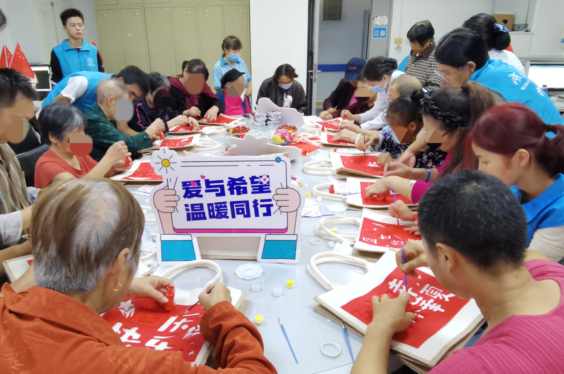 手工制作完成后,5位参与者主动分享创作感受。“我年轻的时候就爱做针线活,今天跟着志愿者又捡起来了,看着这个‘我爱祖国’的挂饰,心里特别敞亮!”一位年过七旬的阿姨拿着自己的作品,眼中满是喜悦;还有位术后恢复期的患者感慨道:“这段时间总担心病情,今天做手工、听健康知识,感觉心里踏实多了,谢谢你们让我过了个有意义的重阳。”真挚的分享引发全场共鸣,不少人频频点头,现场掌声此起彼伏。