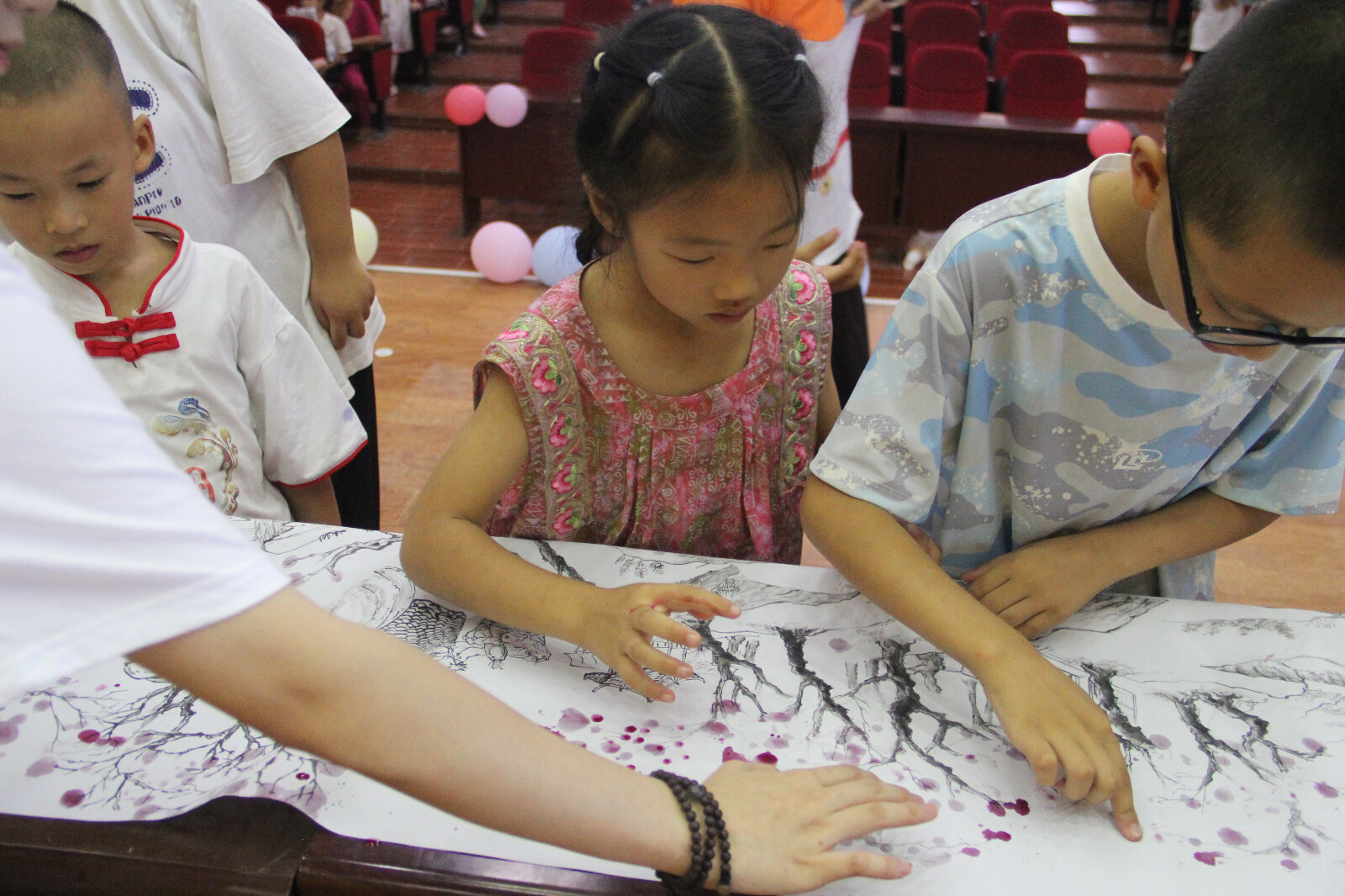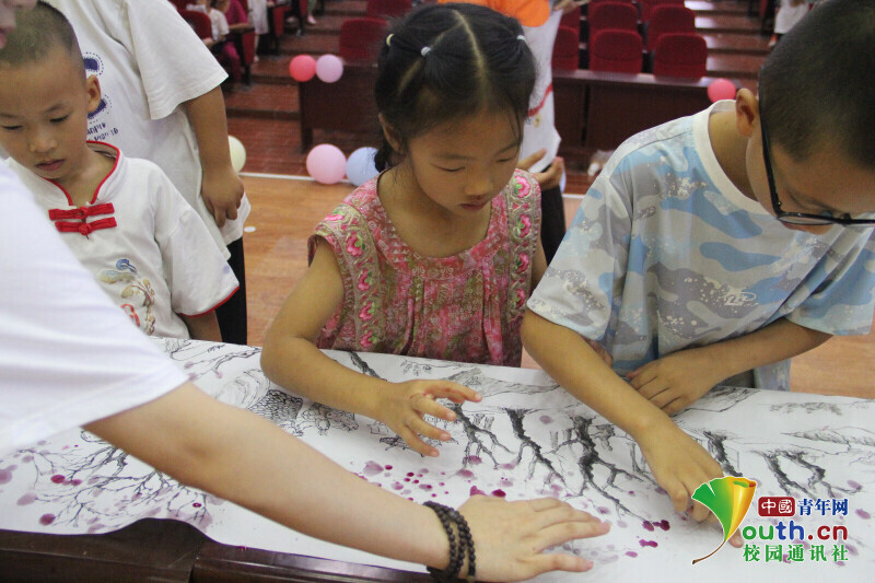 图为小朋友们在共印桃花。罗蕊琪 供图