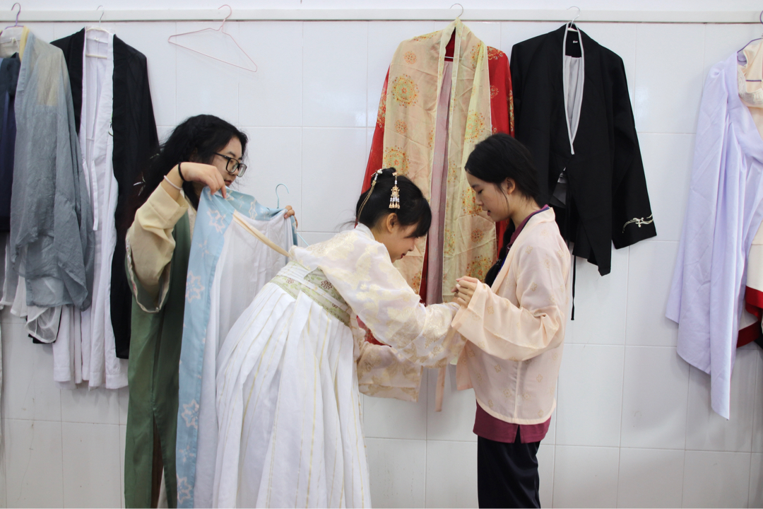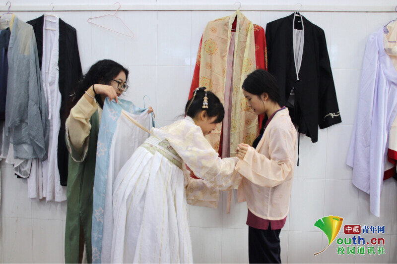图为通商活动中队员帮助聿怀学子更换古装。中国青年网通讯员 黎桂英 供图