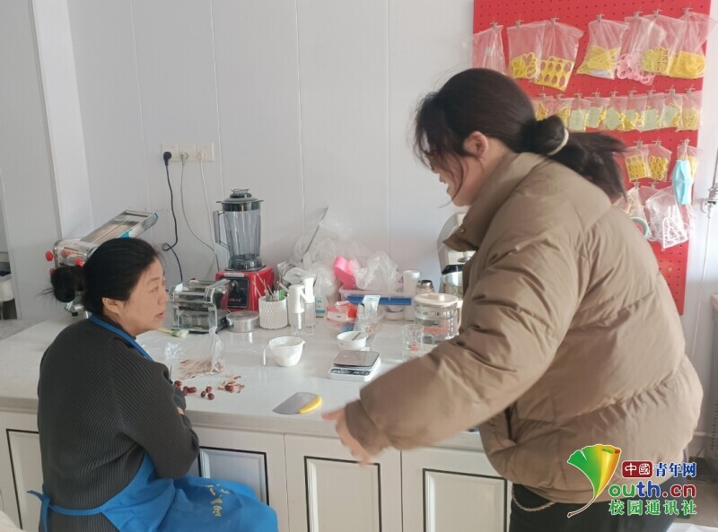 图为店员指导实践队员制作枣饽饽。王钰坤 供图