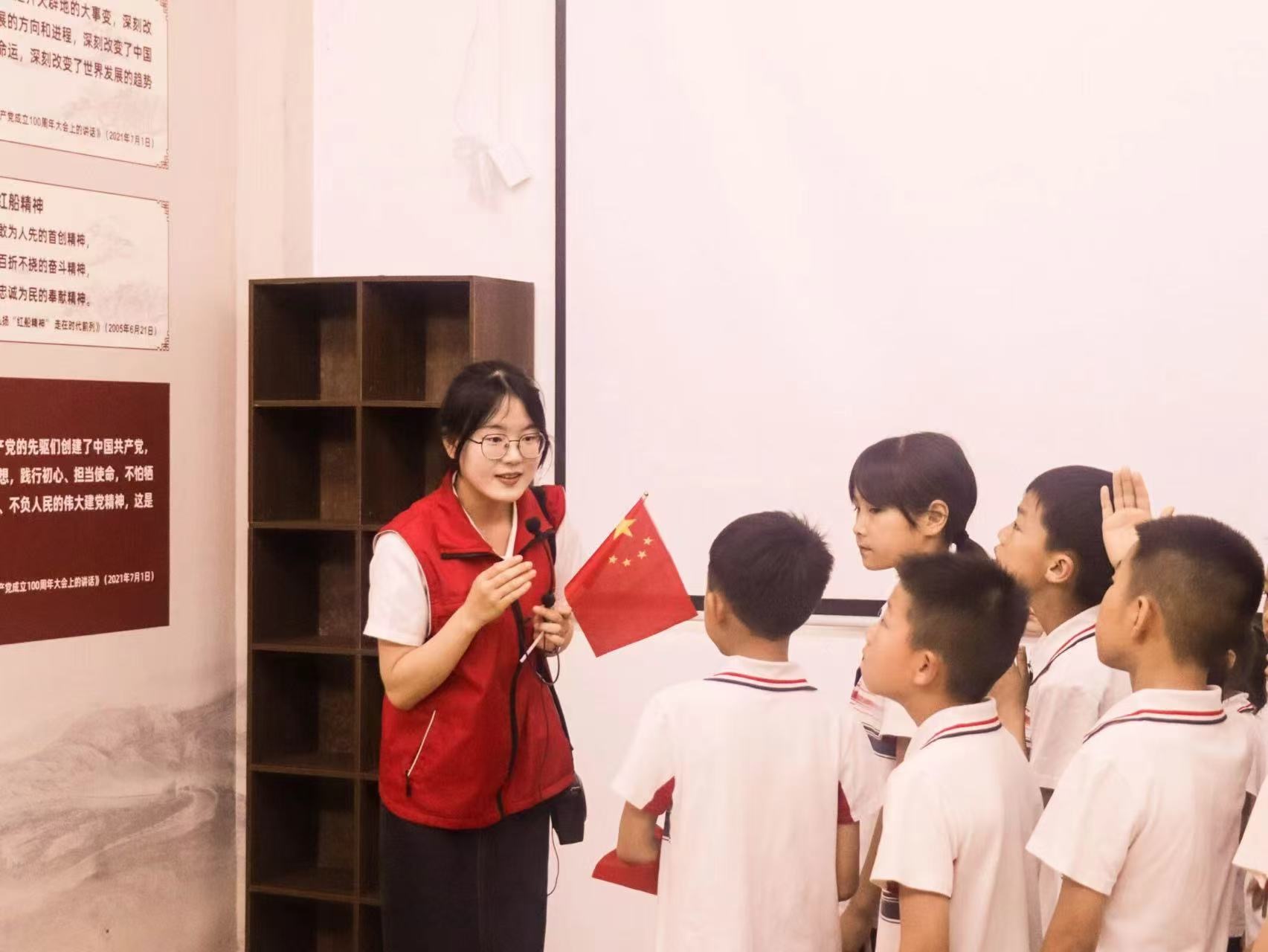 经过充分的准备后,志愿者们与47名小朋友们一起踏上复兴之路,为小朋友们讲述红色故事。走进党建馆,志愿者们用通俗易懂的语言让小朋友们领悟到党的初心和使命以及为人民服务的宗旨。一位小朋友问:“老师,红船是红色的吗?”在接下来的讲解中,志愿者们围绕着“红船”为小朋友们科普了中共一大胜利召开的历史意义。在此期间,活泼可爱的小朋友们发挥“十万个为什么”强烈攻势,志愿者们也十分耐心地回答。在轻松欢快的氛围中,志愿者们带领一行人来到了理论馆,在这里小朋友们齐声高歌《歌唱祖国》,用歌声来祝福祖国繁荣昌盛,一句句铿锵有力的歌词展现了小朋友们意气风发的魅力。本次行走的红色课堂活动的成功开展,获得尧治河小学师生们的一致好评,尧治河小学校长高校长表示:“很感谢你们跋山涉水来与尧治河小学的孩子们共上一堂思政课,你们都是好样的,如果有机会的话,希望你们明年再来!”(通讯员 李雨萌 徐倩 周书珍)