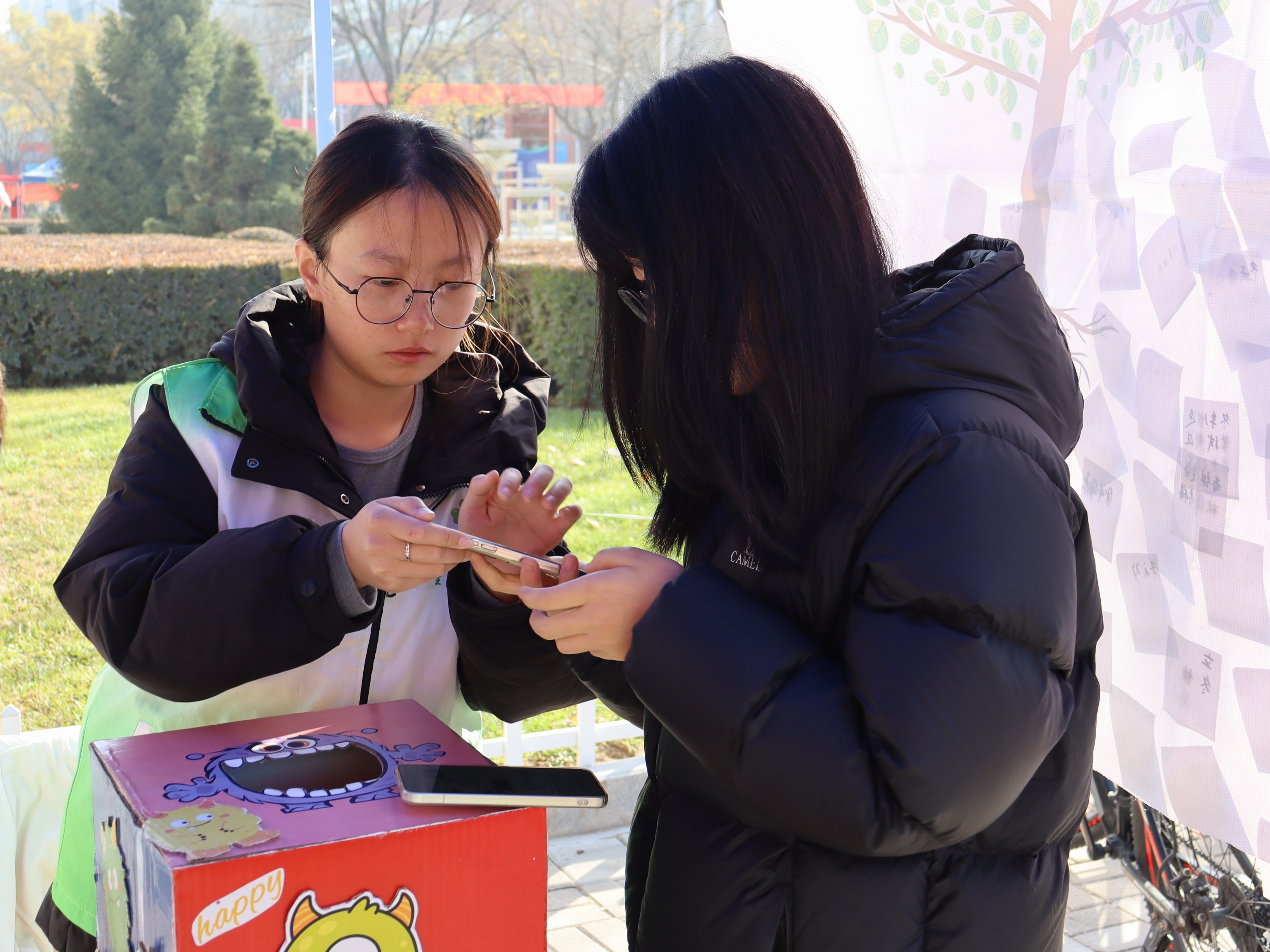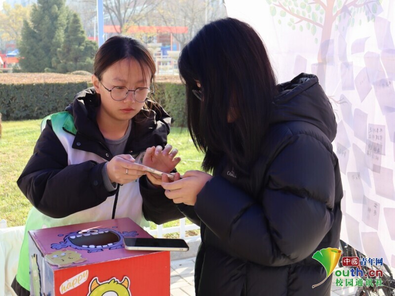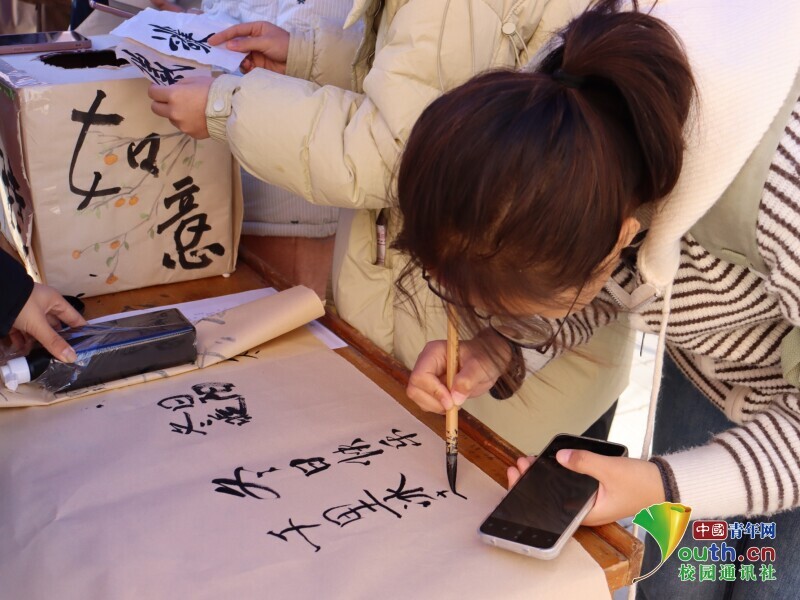 2023级生物技术专业的王宇是第一次接触毛笔书法,在志愿者的点拨下,他颤巍巍地写下“暖冬如愿”四个字,看着宣纸上晕开的墨痕,他笑着说:“字虽然写得歪歪扭扭,但把心里想的温暖都写进去了,这种感觉特别真切。”从“岁寒三友”的雅致寄语,到“冬安顺遂”的质朴祝福,同学们笔下的每一个字,都成了冬日里最鲜活的温情载体。 “我们想让同学们在提笔落笔间,感受传统文化的温度,也让祝福不再只是口头的话语,而是能触摸到的墨香。”活动负责人表示,书法环节的设置,既是对传统笔墨文化的传承,也是让学子们在慢下来的书写中,梳理心底的温暖与期许。