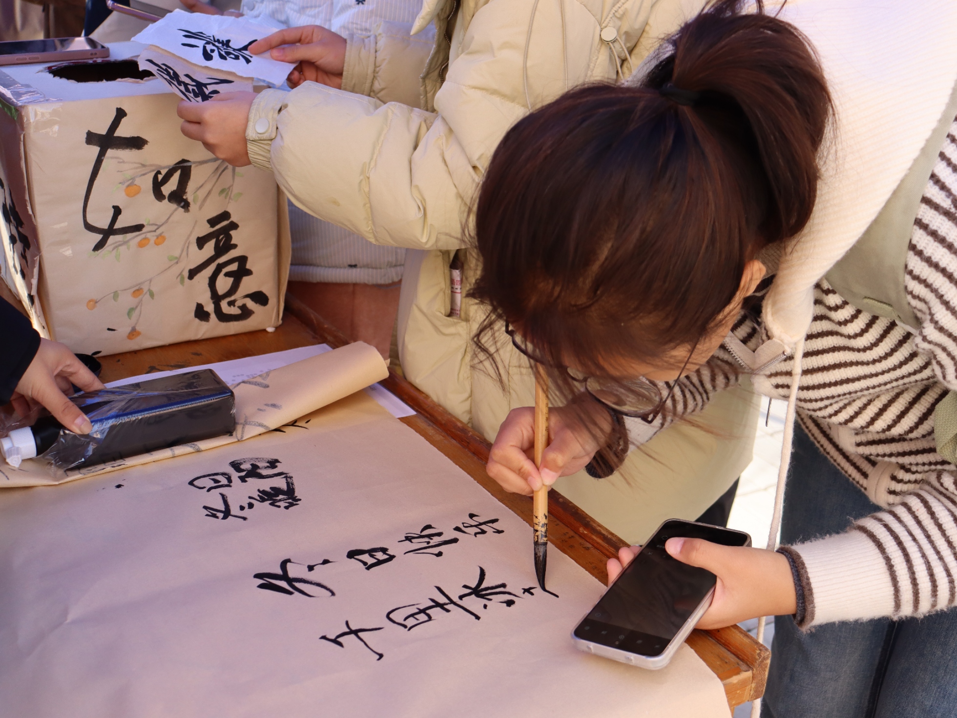活动现场,志愿者摆开狼毫笔、生宣纸,研好松烟墨,邀学子们以笔墨书写冬日祝福,让传统书法文化与暖冬温情在笔尖碰撞交融。志愿者们不仅为初次握笔的同学耐心讲解执笔姿势、运笔技巧,还手把手指导起笔、行笔与收笔的要领。