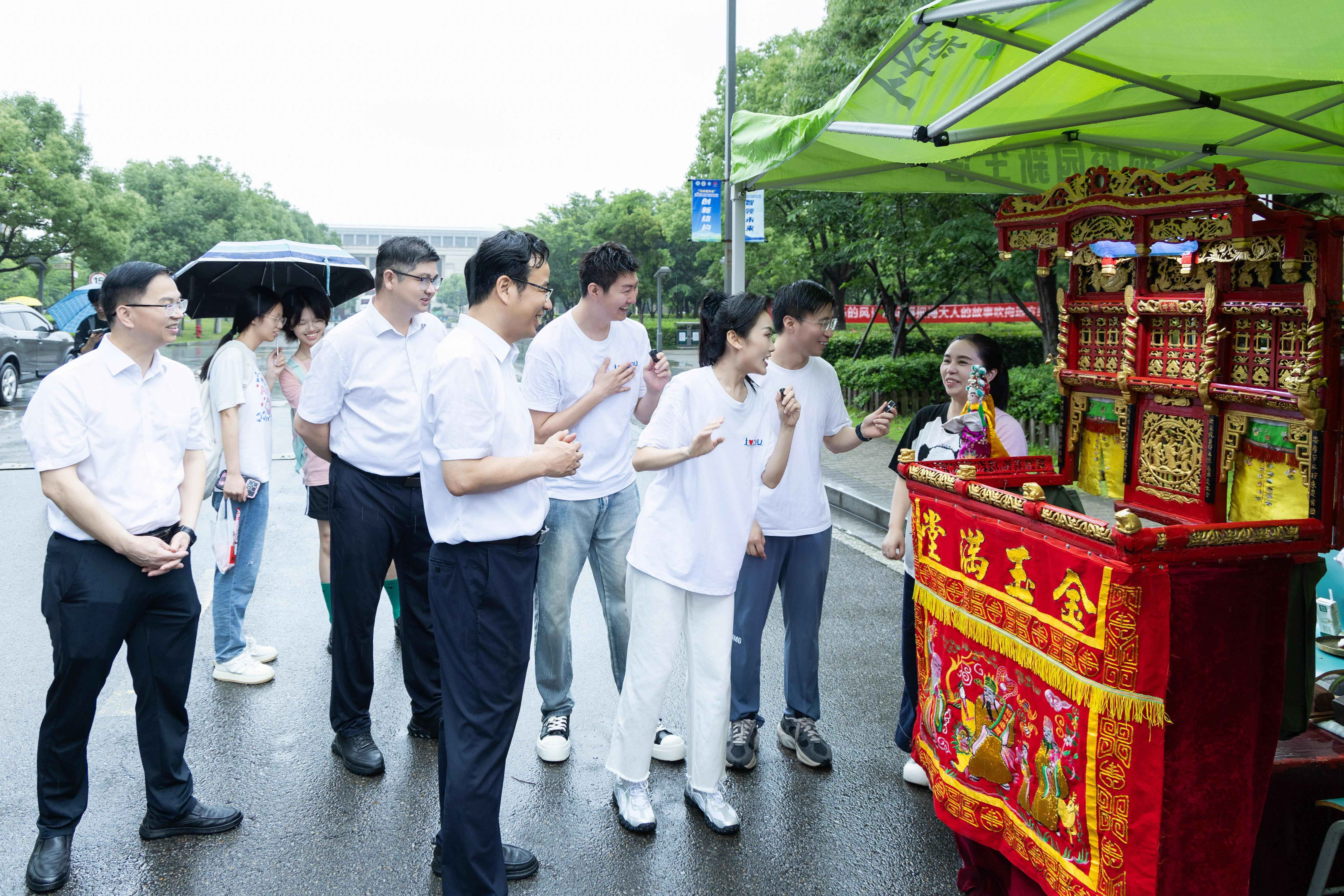 图为现场参观者感受定海布袋木偶戏。浙江海洋大学供图