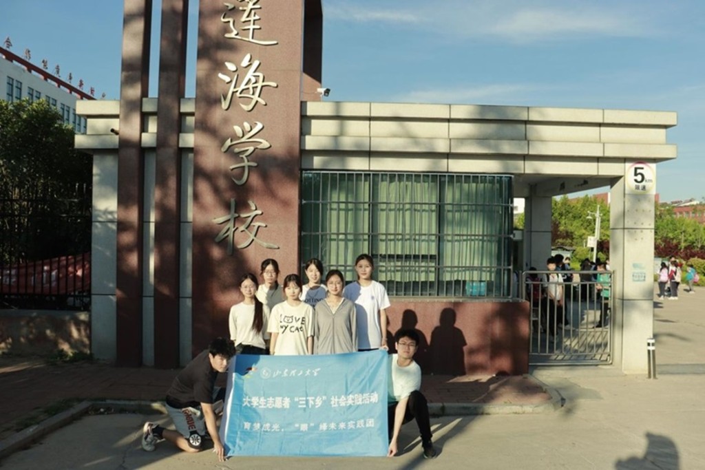 图为育梦成光,“眼”绎未来实践团成员在学校牌匾前合影留念。王一 供图
