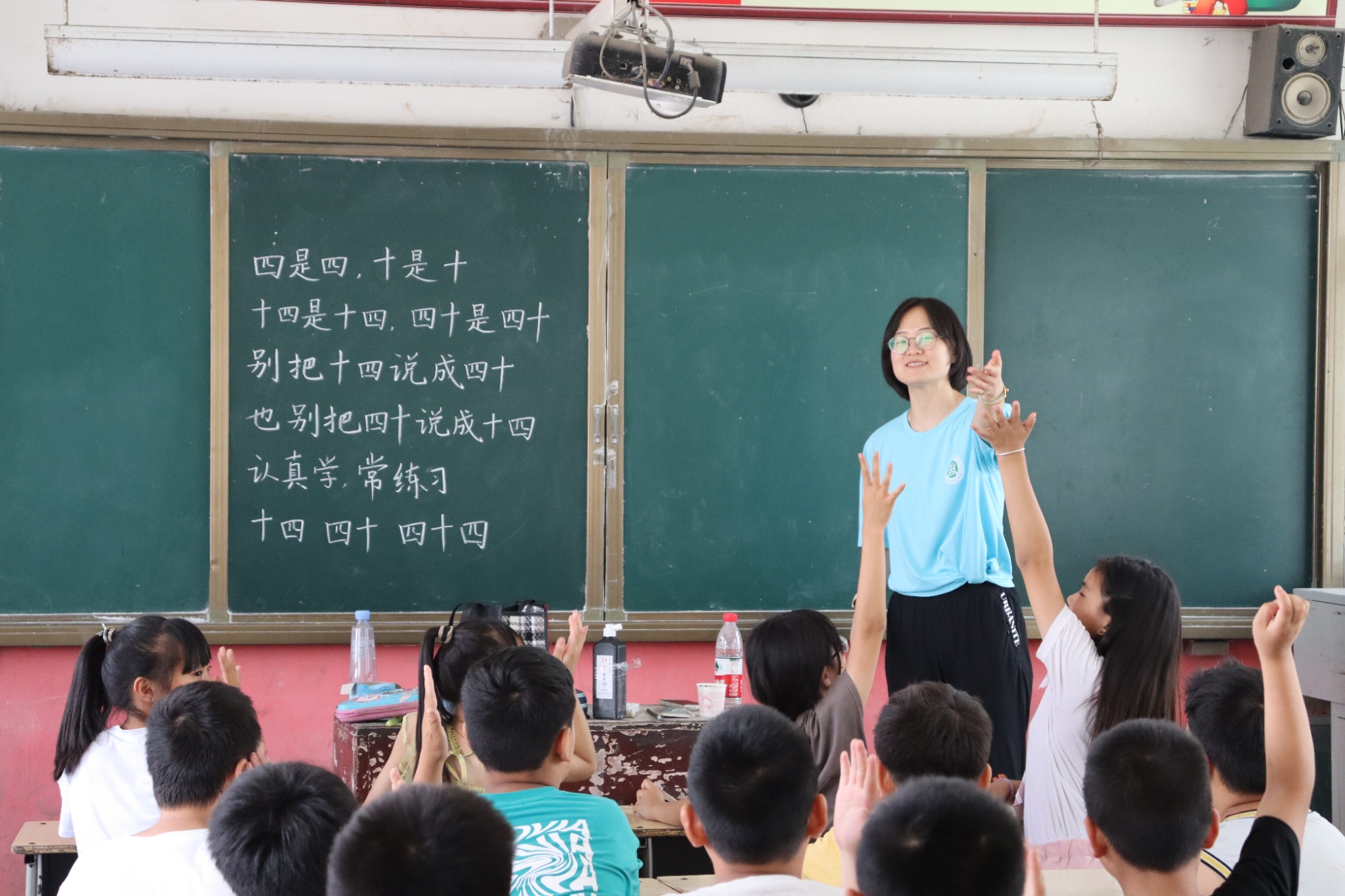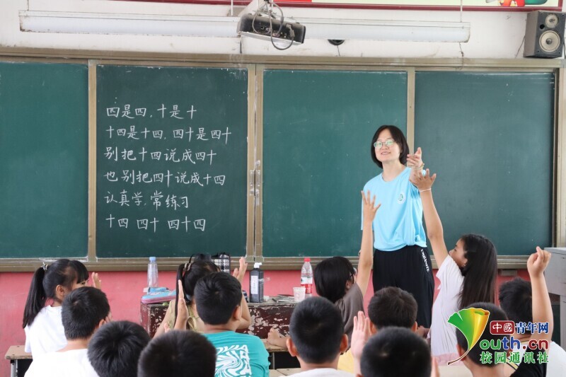 在支教活动实践中,队员们发现乡村学生的普通话基础较为薄弱,日常交流多以方言为主,对普通话的学习积极性不高。对此,队员们设计了一系列生动有趣的教学活动,提高了孩子们对语言的学习热情。首先,对于孩子们的普通话口音进行了纠正,通过绕口令练习进行巩固,通过队员们耐心细致的教学,孩子们对普通话学习的兴趣和信心逐步提升。其次,由实践队员闫佳敏与李欣雨为孩子们讲解朗诵技巧,学习古诗朗诵。在教学活动中,孩子们也由最初的胆怯、害羞、紧张逐步到自信大方的展示自己的朗诵。最后,实践队员对孩子们的课堂表现表示肯定,并鼓励孩子们在今后的学习生活中多讲普通话。
