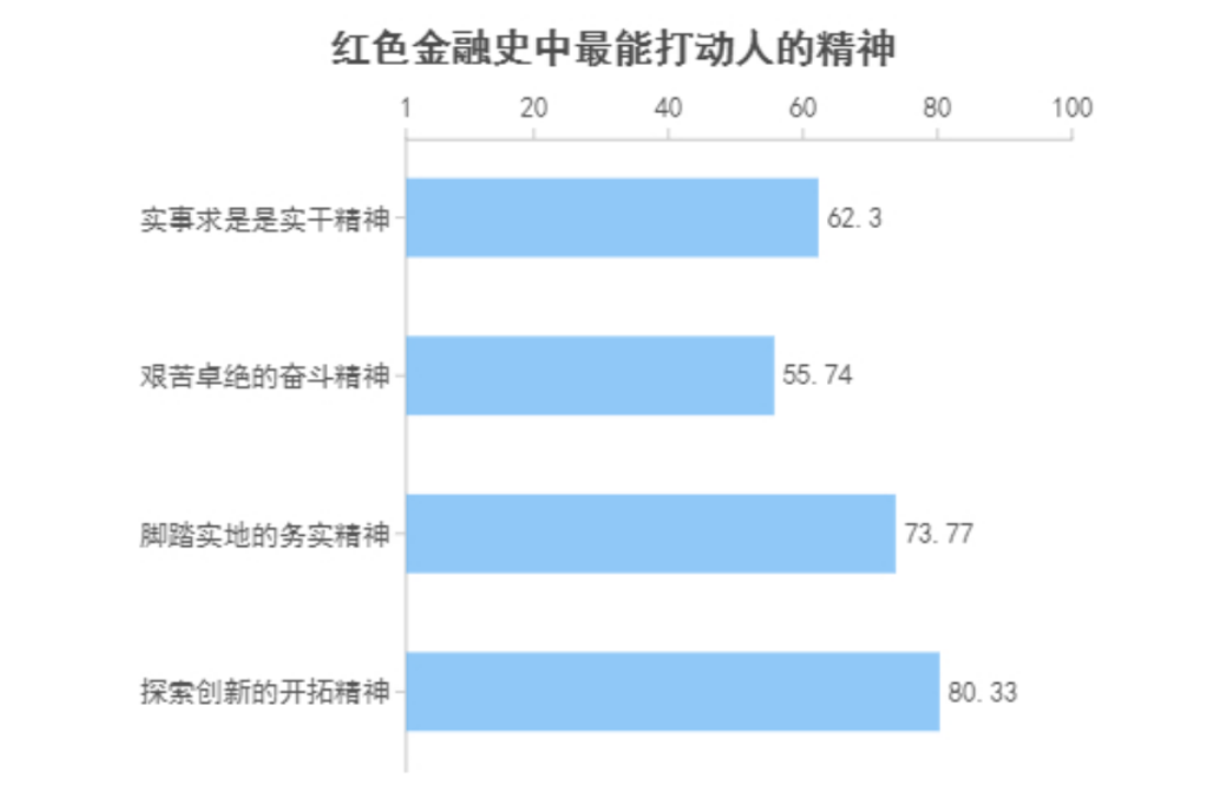 图为红色金融史中最能打动人的精神。中国青年网通讯员 王煜诚 摄通过调查结果得出,无论是探索创新的开拓精神、脚踏实地的务实精神、艰苦卓绝的奋斗精神还是实事求是的实干精神,都深深打动了受访者。其中,探索创新的开拓精神最令受访者印象深刻,同时也说明探索创新在当下时代的重要性。